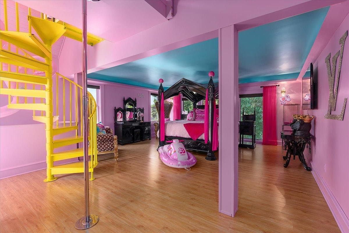 This vibrant kid’s bedroom features playful colors that ignite imagination. Walls in bold shades of pink harmonize with a striking turquoise ceiling, creating a whimsical atmosphere. A spiral yellow staircase adds a fun architectural twist, leading to a lofted area. Central to the room is a lavishly adorned four-poster bed with plush pink accents, exuding a royal charm. Complementing the playful theme, unique furnishings, including a stylish black vanity and a quirky chair, enhance functionality and aesthetic appeal. The room is designed for both comfort and fun, making it an ideal space for creative play and restful sleep.