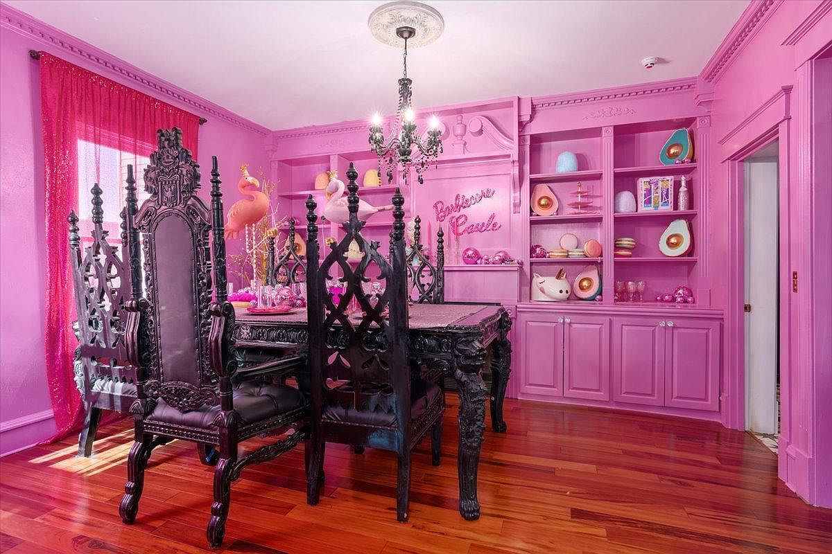 Vibrant pink walls envelop this whimsical dining room, exuding a playful and cozy atmosphere. The grand black dining table, adorned with intricate carvings, serves as the centerpiece, surrounded by striking high-backed chairs that blend elegance with a touch of drama. Romantic lighting is provided by a chic chandelier, enhancing the playful ambiance. Bright, sheer curtains frame the windows, allowing natural light to illuminate the space. Shelving displays a curated collection of pastel decor and playful accents, including unicorns and flamingos. This family-friendly dining area is perfect for gatherings, fostering a lively and imaginative dining experience.