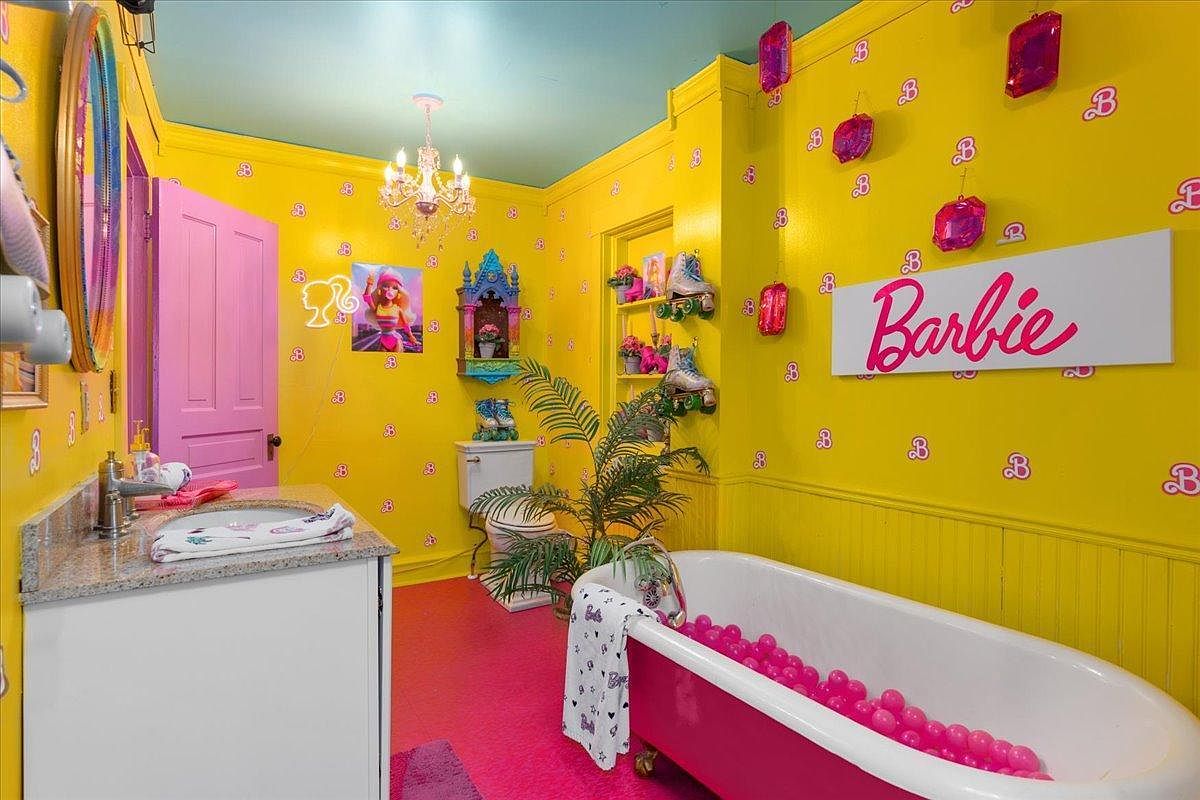 This vibrant bathroom captures a playful aesthetic with its bold yellow walls adorned with whimsical Barbie motifs, creating a fun atmosphere. A classic clawfoot tub, accented with pink and filled with colorful balls, invites relaxation. The pink door adds a modern twist, harmonizing with the chandelier that offers elegance against the playful backdrop. Bright decorative shelves hold stylish accessories and roller skates, appealing to family-friendly fun. A tropical touch from the palm plant enhances its charm, while the glossy pink lettering of ‘Barbie’ stands out, completing this delightful homage to childhood nostalgia.