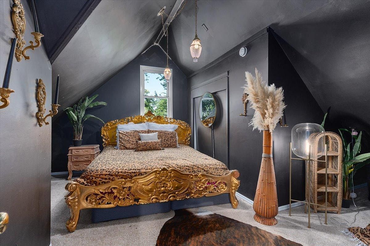 This striking bedroom blends luxury and bold aesthetics, featuring a magnificent gold bed frame adorned with a wild leopard print duvet, elegantly contrasting against the deep black walls. The sloped ceiling adds character to the space, while strategically placed windows allow natural light to illuminate the room, accentuating its richness. Vintage-inspired pendant lights provide warm, ambient illumination. Decorative elements include lush green plants, a stylish round mirror, and a unique bamboo vase showcasing feathery pampas grass. A plush carpet underfoot invites comfort, making this retreat a perfect family-friendly haven for relaxation and inspiration.