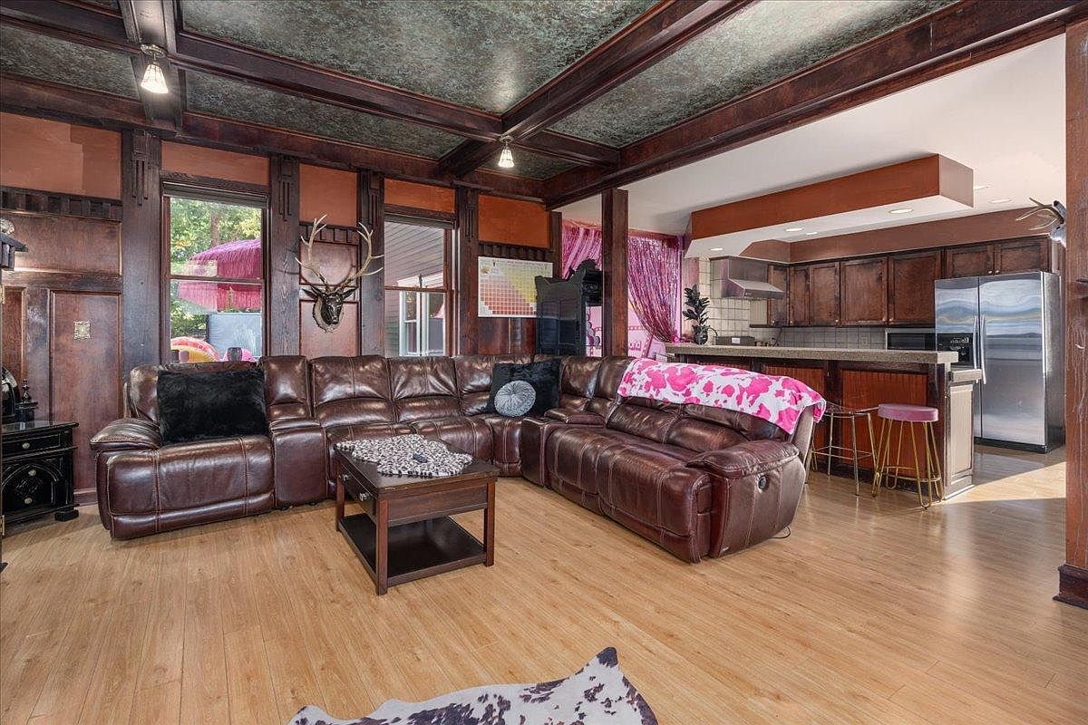 This inviting living room features a spacious layout ideal for family gatherings, showcasing a luxurious dark brown leather sectional that offers ample seating. Accentuated by a mix of rustic wooden walls and modern touches, the space is balanced with warm earthy tones and natural light filtering through large windows. The rich, tonal contrasts of the furniture harmonize beautifully with the sleek kitchen visible in the background, adding a contemporary flair. Decorative elements such as an elegant coffee table and stylish throw pillows enhance comfort, while fun, vibrant accents like pink in the kitchen area bring playful energy to the ambiance.