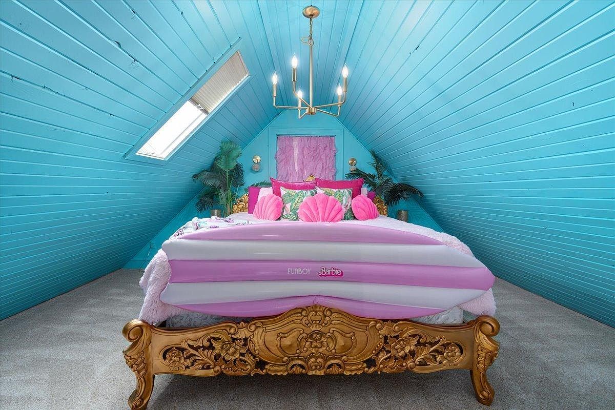 This enchanting bedroom, tucked in an attic, showcases a vibrant color scheme featuring bold turquoise walls that create a cheerful ambiance. The elegantly detailed golden bed frame acts as a stunning focal point, adorned with luxe pink and tropical-themed bedding. Decorative elements, like plush shell-shaped cushions and playful inflatable accessories, lend a fun, beachy vibe. Natural light floods in through a charming skylight, enhancing the sense of openness. Lush greenery adds a refreshing touch, providing a sense of tranquility. Thoughtfully designed, this space seamlessly marries whimsical aesthetics with comfortable, family-friendly furnishings for a truly inviting atmosphere.