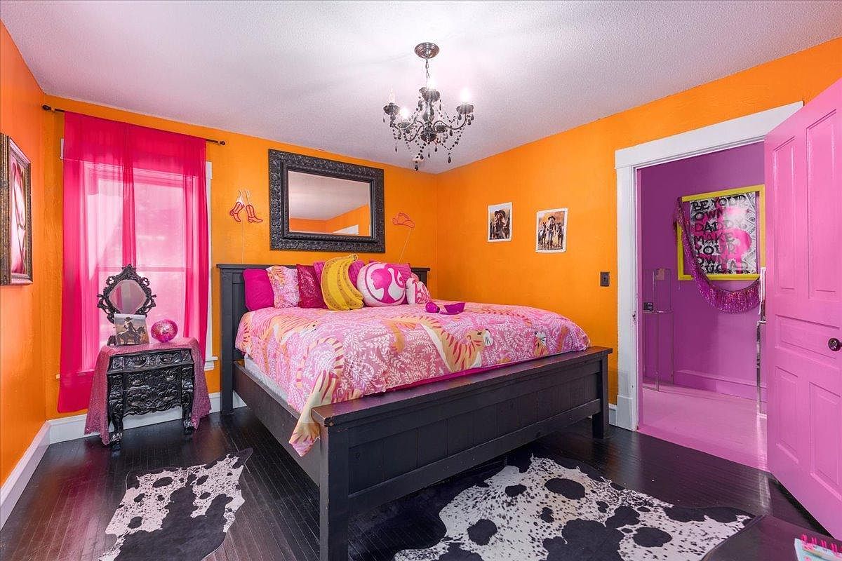 Vibrant and playful, this kid’s bedroom is designed to inspire creativity and joy. The bold orange walls combined with pink accents create an energizing atmosphere, while black hardwood floors add a striking contrast. The centerpiece is a spacious bed adorned with a colorful floral comforter and plush pillows in shades of pink and yellow, inviting cozy relaxation. A chic black nightstand complements the decor, topped with a decorative mirror and a shimmering orb. The pink-framed door leads to another lively space, ensuring functionality while maintaining a fun aesthetic. This room is a perfect blend of style and comfort for any young dreamer.