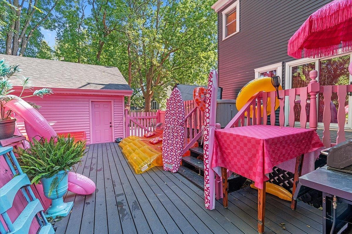 This outdoor space bursts with personality, featuring cheerful pink accents that create a whimsical atmosphere. The planked wooden deck offers ample room for relaxation, while a charming pink table adorned with a checkered tablecloth invites family gatherings. Brightly colored pool floats add a playful touch, ideal for summer fun. Lush greenery in decorative pots enhances the lively vibe, complementing the colorful furnishings. A fence painted in a similar hue encircles the area, providing both safety and style. This inviting patio is perfect for entertaining and enjoying sunny days, embodying a family-friendly retreat complete with an abundance of color and charm.