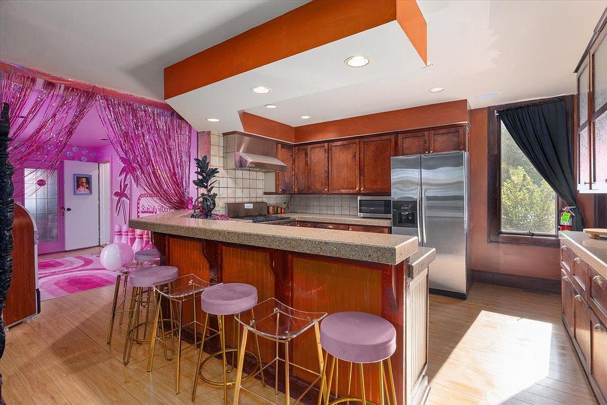 The kitchen boasts a striking blend of contemporary and playful designs, featuring warm wooden cabinetry paired with modern stainless-steel appliances. A unique bar area showcases transparent acrylic stools with plush purple cushions, adding a vibrant pop against the textured countertop. An inviting color scheme of earthy browns and lively pinks creates an energetic atmosphere. Glittering pink drapes frame the entrance, leading to a cozy area adorned with whimsical decor, perfect for family gatherings. Ample natural light floods the space through large windows, enhancing the cheerful ambiance while ensuring functionality for culinary adventures.