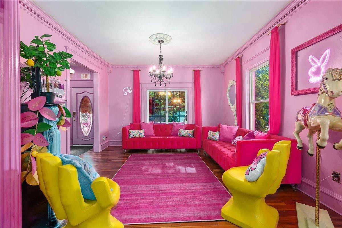 This lively living room bursts with a playful pink palette, enveloping the space in warmth and cheer. The plush seating features bright pink couches adorned with colorful cushions, creating an inviting atmosphere perfect for gatherings. A striking pink area rug anchors the room, enhancing its cozy feel. Large windows, dressed with flowing pink drapes, flood the room with natural light, accentuating the charming chandelier overhead. Funky yellow chairs add a whimsical touch, while fun decor elements, like a neon sign and a playful rocking horse, offer unique character. This room effortlessly blends style with family-friendly features, making it a delightful haven.
