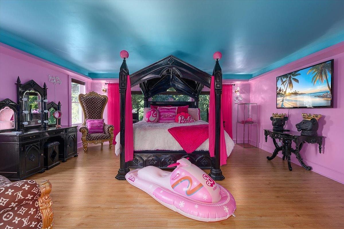 An enchanting kid’s bedroom exuding playful charm and vibrant energy, designed with bright pink walls and a striking blue ceiling. The focal point is a stunning four-poster bed draped in soft pink fabrics, complemented by luxurious Barbie-themed pillows. A regal golden chair adds sophistication, while the intricately carved black vanity offers a stylish space for playtime and creativity. Ample storage is accommodated in stylish cases, ensuring a neat area for toys and treasures. The room is illuminated by warm lighting, creating a cozy atmosphere, while whimsical decor, including a floatie, invites endless fun and imagination.