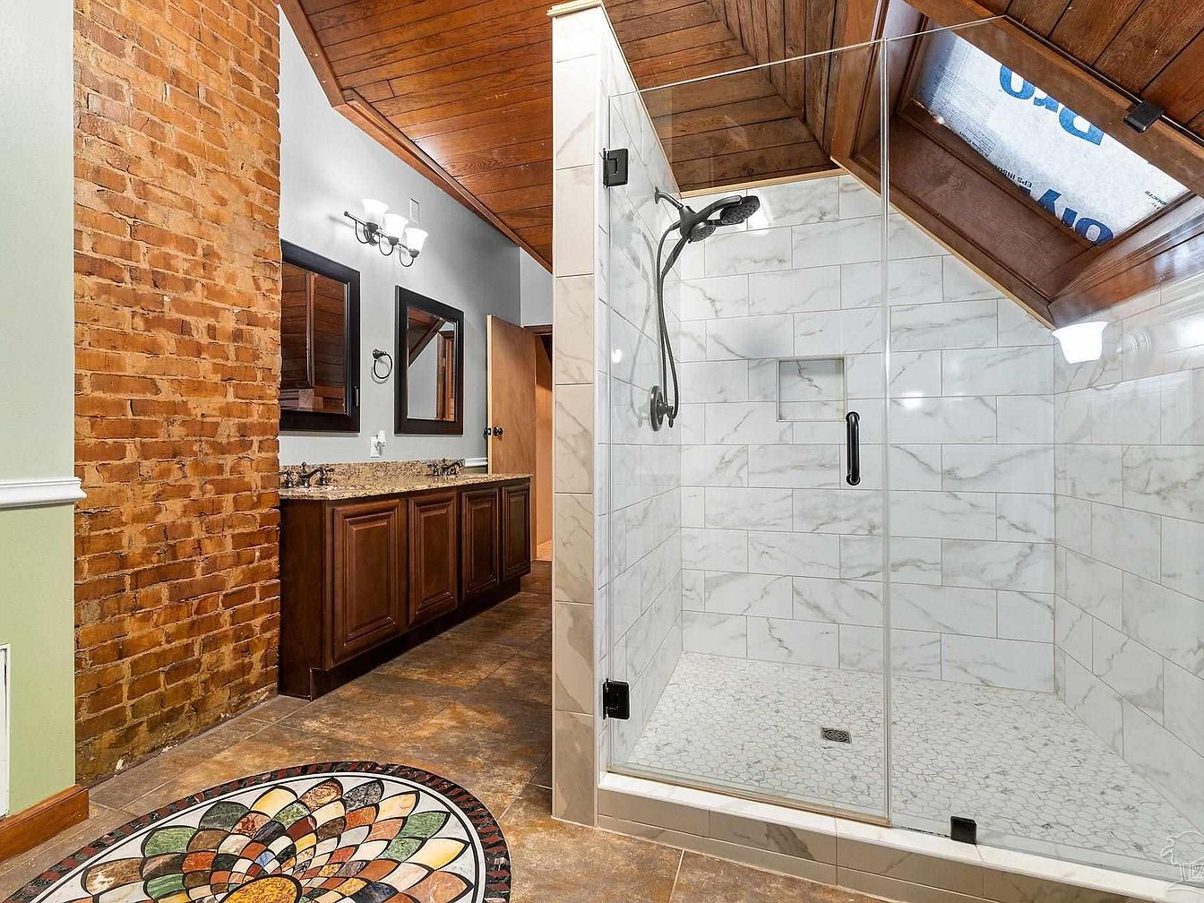 This stunning bathroom merges rustic charm with modern elegance. Featuring exposed brick walls, the space showcases a striking contrast against sleek, white marble tiles in the shower. A spacious walk-in shower boasts glass enclosures and elegant fixtures, perfectly practical for family use. The double vanity offers ample storage with rich, dark cabinetry and a granite countertop, ensuring functionality without sacrificing style. A vibrant, intricate mosaic tile floor adds artistic flair, while warm wooden ceilings contribute a cozy ambiance. This thoughtful combination of textures and colors creates a family-friendly oasis that feels both welcoming and luxurious.