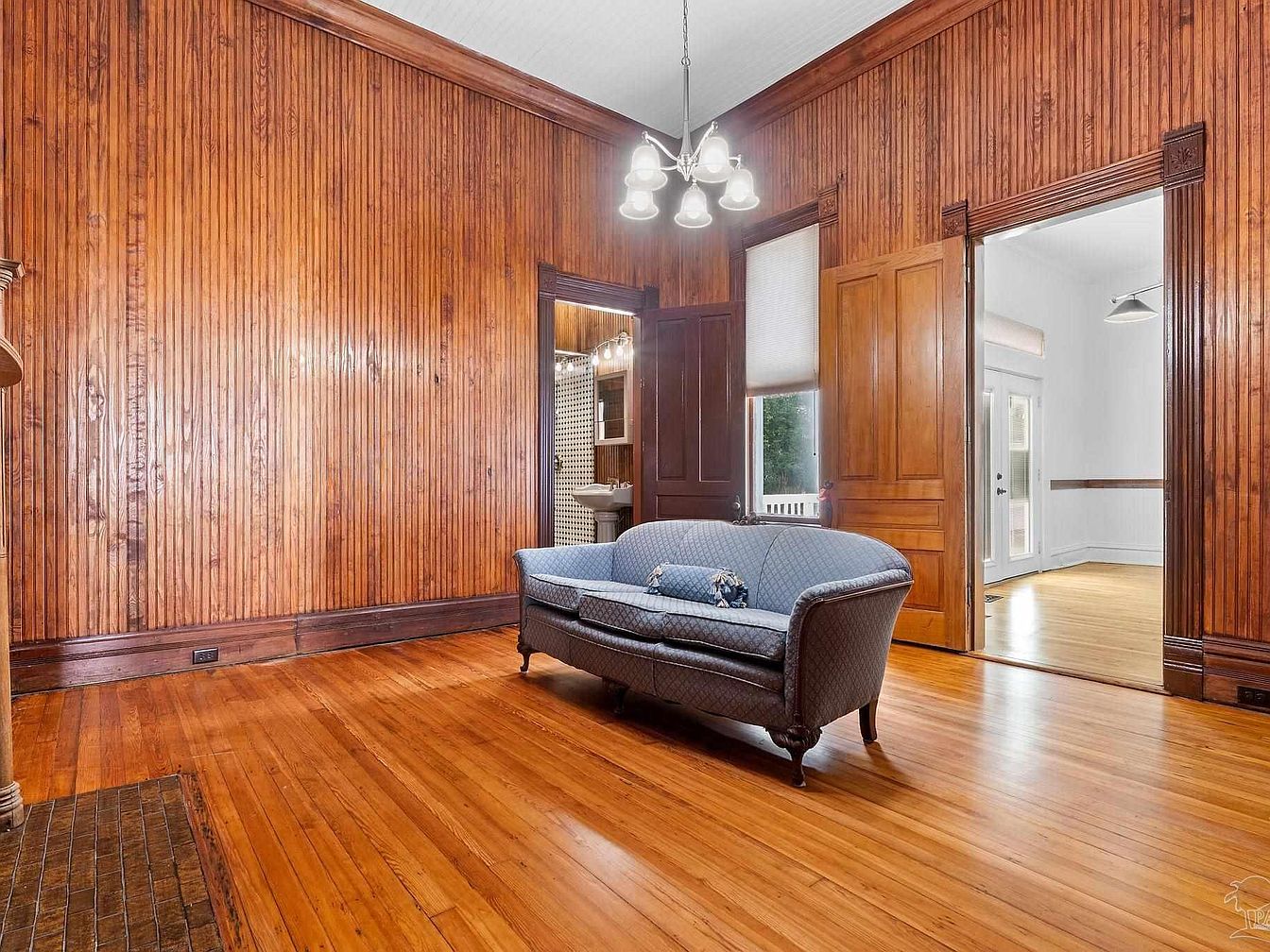 This inviting living room features rich, warm wood paneling that creates a cozy and elegant atmosphere. The classic blue upholstered couch complements the polished hardwood floors, enhancing the inviting feel of the space. Architectural highlights include the intricately carved fireplace mantle, which serves as a charming focal point beneath the soft glow of the multi-light pendant chandelier. Dual doors lead to adjoining rooms, promoting a flowing layout ideal for family gatherings or entertaining. The combination of sophisticated hues and vintage details offers a timeless appeal, making it an ideal space for relaxation and cherished moments.