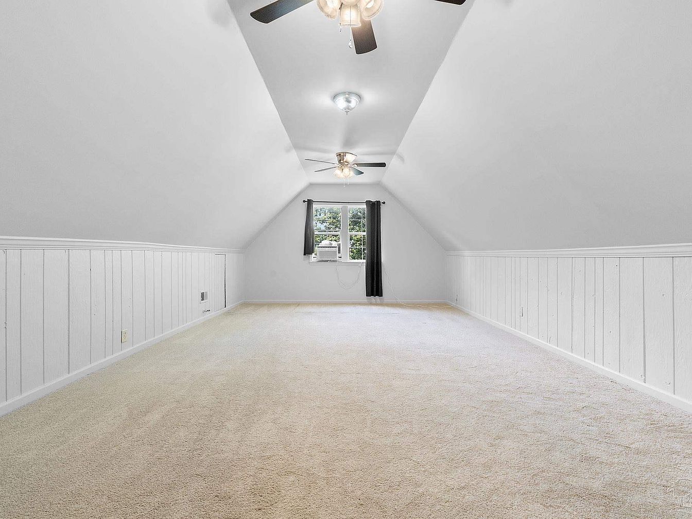 This spacious attic living area features a bright and airy design with vaulted ceilings and two ceiling fans for optimal airflow. The soft, plush carpeting adds warmth while enhancing comfort, making it an inviting retreat for family gatherings or playtime. White paneled walls offer a clean, modern aesthetic, perfectly complemented by large windows that bring in natural light and picturesque views. Dark curtains provide privacy when needed. The open layout allows for versatile use, whether transforming it into a cozy reading nook, a children’s play area, or an additional bedroom, ensuring it meets all family needs.