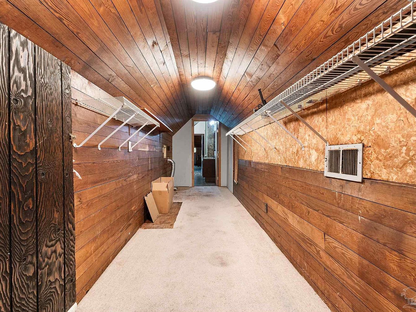 This spacious walk-in closet features a unique architectural design with a vaulted wooden ceiling that adds character and warmth. Rich, dark-stained wood paneling lines the walls, creating an inviting, rustic ambiance. White wire shelving runs along both sides, providing ample storage for clothing and accessories, while the plush carpet adds comfort underfoot. Strategic lighting enhances the natural beauty of the wood, illuminating the space and making it easy to find items. The layout promotes organization, with easy accessibility to belongings, making this closet a perfect blend of functionality and aesthetics for family needs.