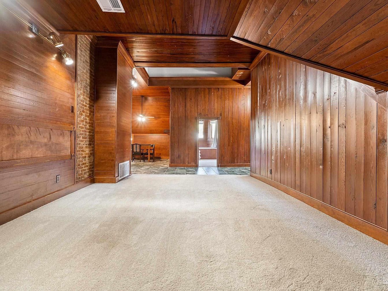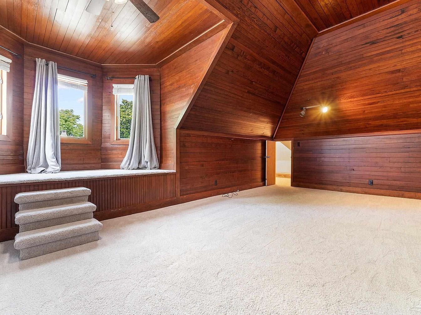 This charming attic space features beautiful wooden paneling and a unique, sloped ceiling that enhances its cozy atmosphere. Large windows, adorned with flowing gray curtains, allow natural light to fill the room while providing scenic views of the outdoors. The plush, carpeted flooring adds warmth and comfort, making it an inviting retreat. A small step-up area provides access to a cozy window seat, perfect for lounging or reading. This versatile space could serve as a cozy reading nook, children’s play area, or even a small home office, combining aesthetic appeal with practical family-friendly features.