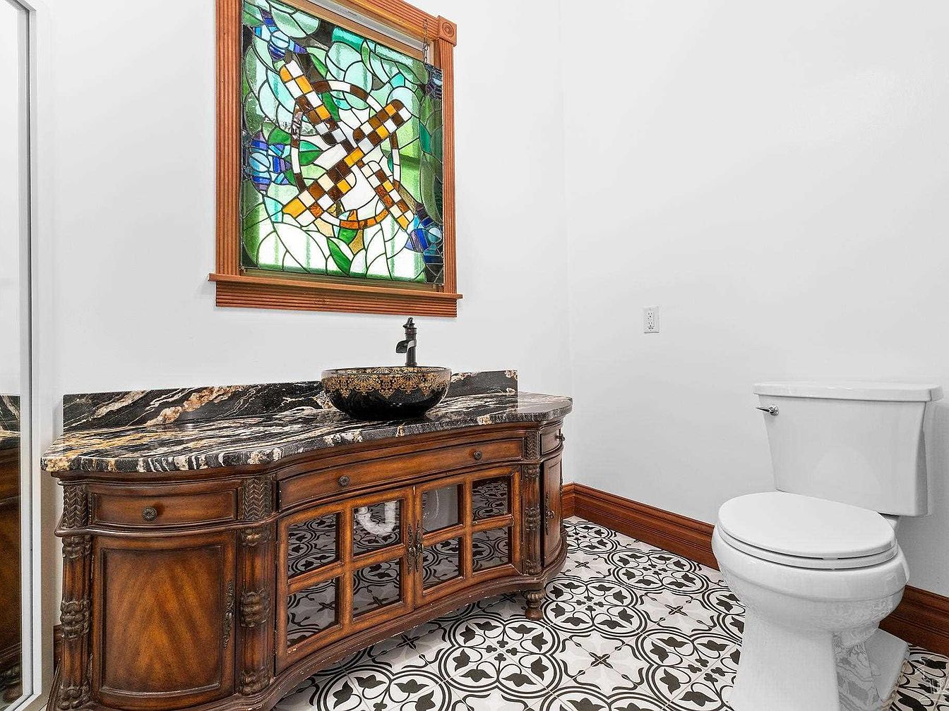 This elegant bathroom showcases a stunning blend of modern sophistication and traditional charm. The focal point is a beautifully crafted vanity with a rich wooden finish, complemented by an exquisite black marble countertop. A unique, round vessel sink adds a contemporary touch, contrasting with the ornate cabinetry. Behind the vanity, a vibrant stained-glass window filters light, creating an inviting atmosphere. The striking black and white patterned tile flooring enhances the space’s character while ensuring durability. Clean lines and subtle architectural details combine to create a serene environment, making it a perfect retreat for family and guests.