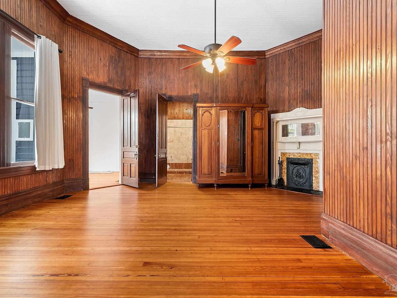 This inviting living room features rich wooden paneling that encompasses the walls, creating a warm and timeless atmosphere. Natural light floods through large windows, accentuated by soft white drapes. The beautiful hardwood floor complements the vintage charm, while the ornate fireplace adds a classic focal point. A stylish ceiling fan contributes to air circulation, perfect for family gatherings. Key architectural details include intricate molding and a cozy nook for storage or display. The layout offers space for comfortable seating arrangements, making it ideal for both relaxation and entertaining, welcoming family and friends in style.