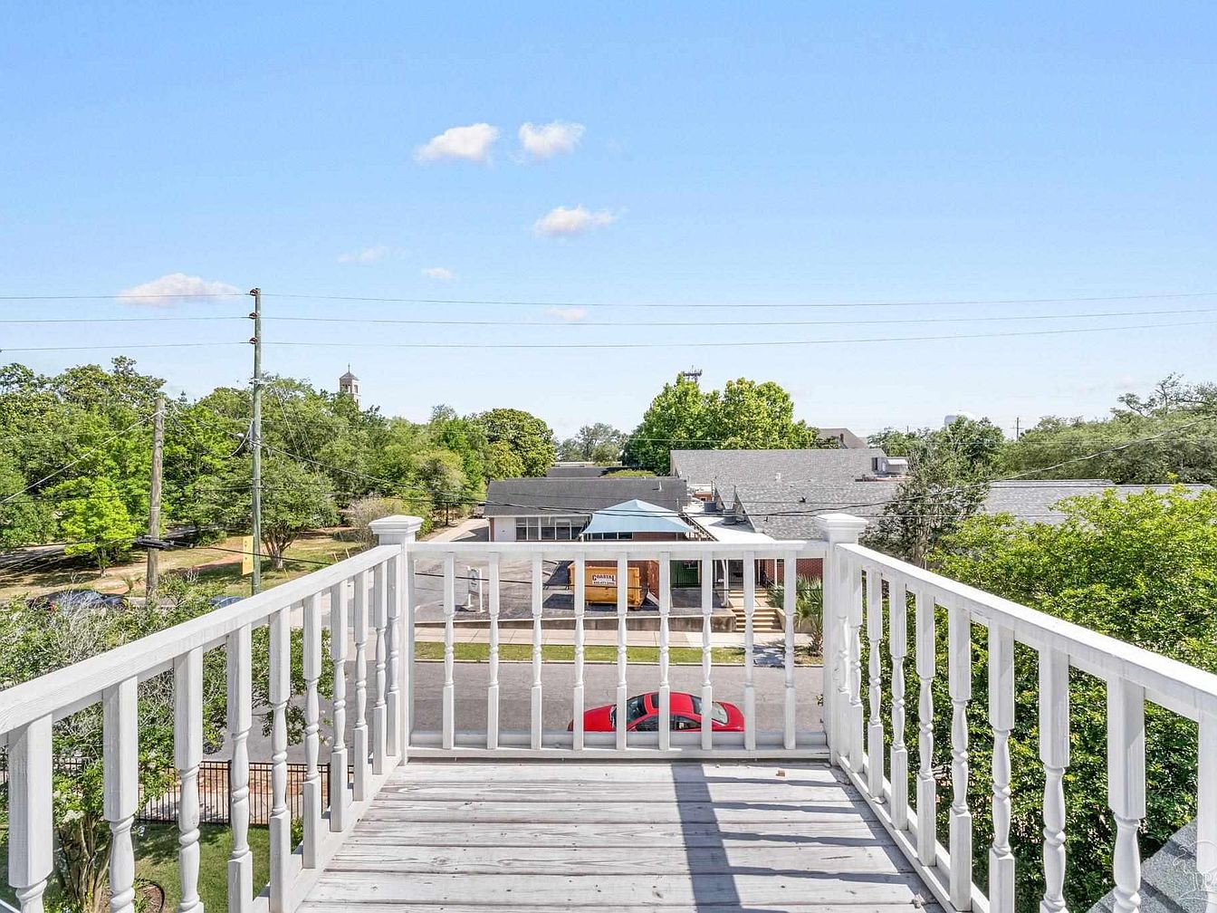 A charming rooftop deck offers an inviting space, surrounded by a classic white railing that enhances the open feel. The wooden flooring is sunlit, creating a warm atmosphere ideal for relaxation or social gatherings. Lush green trees frame the view, adding natural beauty and privacy, while nearby buildings hint at a vibrant community. This outdoor space includes ample room for comfortable seating or decorative plants, making it a perfect spot for family gatherings or quiet moments. The clear blue sky above contributes to a serene backdrop, inviting residents to unwind and enjoy the sights and sounds of their surroundings.