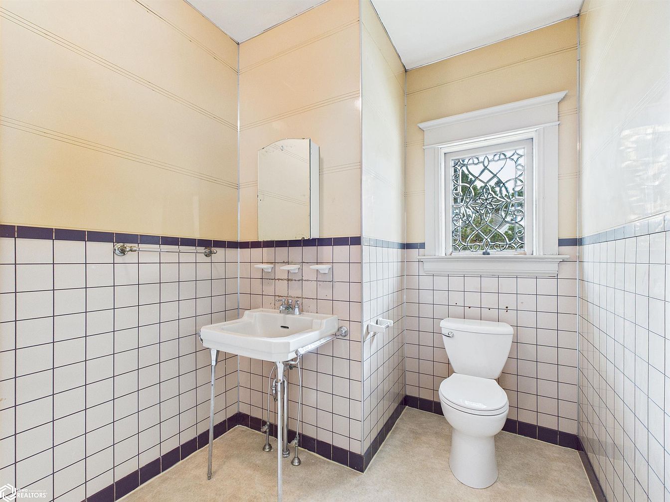 This bathroom corner features a timeless, vintage-inspired charm with white square tiles bordered by a deep purple line, providing a subtle pop of color. The pedestal sink and toilet are arranged for easy access, offering a practical layout ideal for families. The window with ornate decorative glass allows natural light to softly illuminate the space while maintaining privacy. Wall-mounted ceramic soap holders and a towel bar add functional details. Warm cream walls above the tiles create an inviting atmosphere, making the bathroom feel open and airy. The architectural trim around the window enhances the overall character of the room.