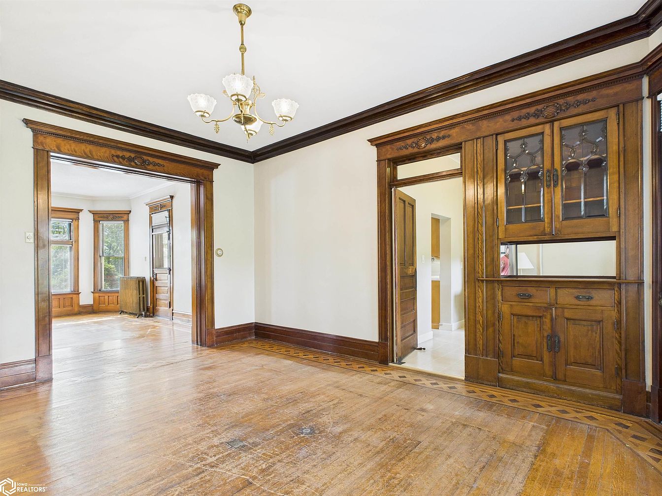 Warmth radiates from this classic dining room, defined by rich, hardwood floors with charming inlaid borders and impressive, craftsman-style built-in cabinetry. The natural wood trim extends gracefully around doorways and along the crown molding, offering a sense of timeless elegance and durability ideal for family gatherings. An ornate brass chandelier lends a touch of vintage sophistication, while wide double doors open seamlessly to an adjoining sunlit living area. Ample natural light streams through tall bay windows, highlighting original millwork and creating an inviting space perfect for meals, conversation, and making lasting memories with loved ones.