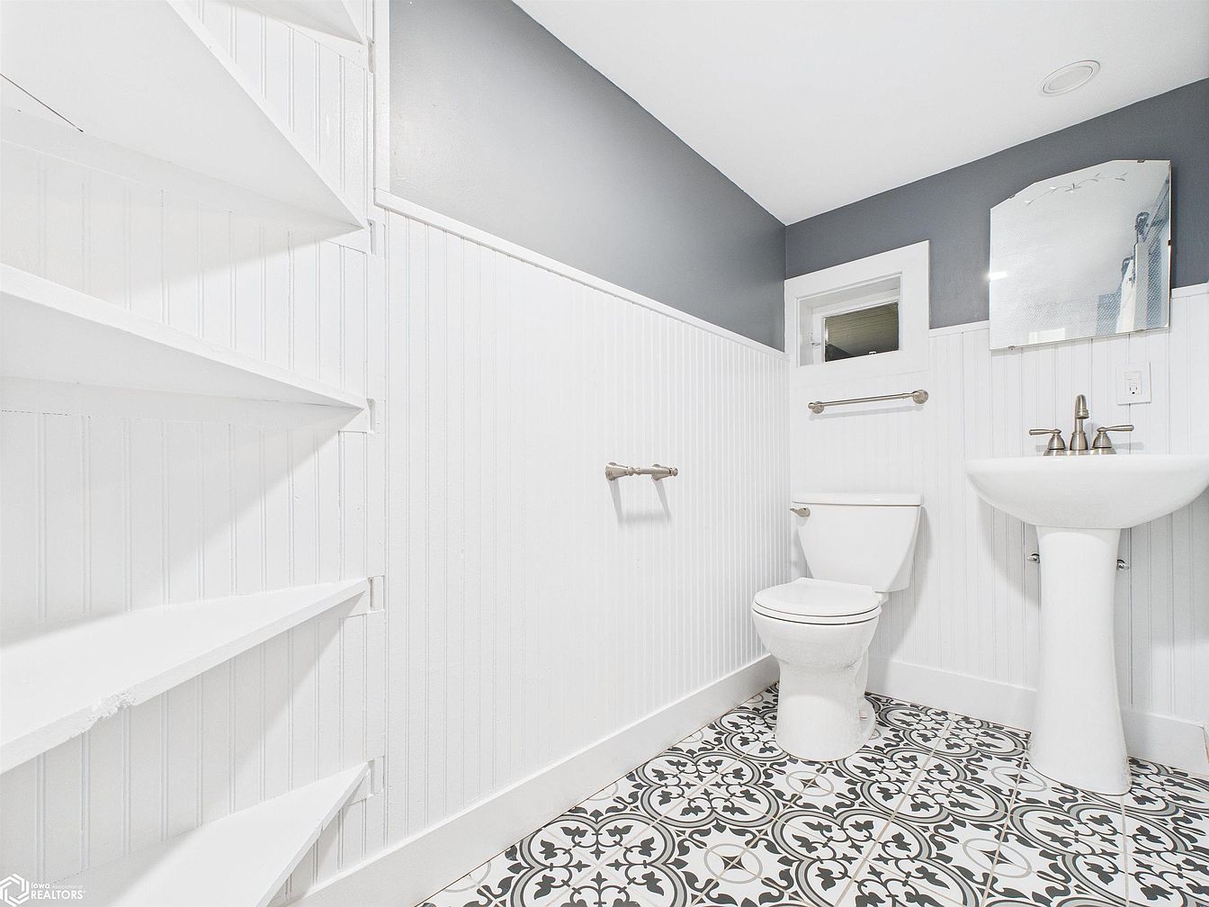 A bright and clean bathroom design featuring crisp white wainscoting that covers the lower half of the walls, contrasted by a cool slate gray on the upper part. The space feels modern yet inviting, thanks to vintage-inspired patterned tiles in black and white that add visual interest to the floor. The pedestal sink and toilet maintain a streamlined look, making the room easy to clean and child-friendly. Built-in corner shelves offer practical storage, perfect for family essentials. The mullioned window brings in natural light, enhancing the inviting atmosphere and ensuring the room is both stylish and highly functional for daily routines.