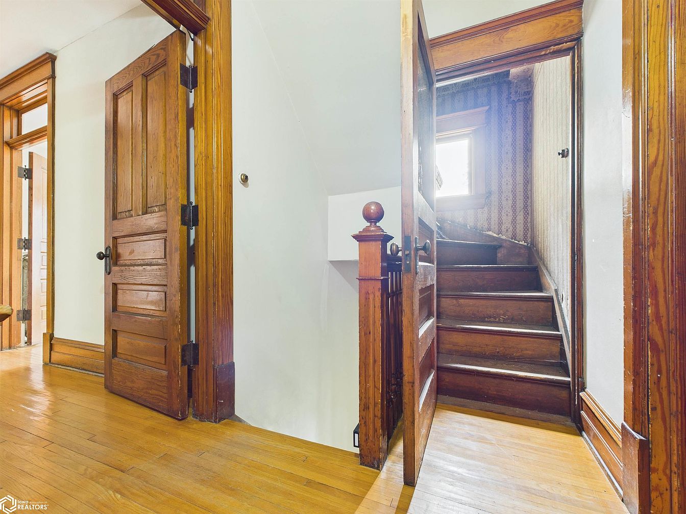 Bright hardwood floors extend through a well-lit hallway, complemented by rich wooden trim and paneled doors that add a touch of traditional elegance. The area showcases a cozy landing with an inviting stairwell leading to an upper level, illuminated by natural light streaming through a nearby window. The craftsmanship of the stair banister, substantial trim work, and classic door hardware contribute to a timeless appeal. Neutral wall tones create a welcoming atmosphere, suitable for family living and everyday traffic. This charming space provides practical access to multiple rooms, making it ideal for families who value comfort and connectivity in their home layout.