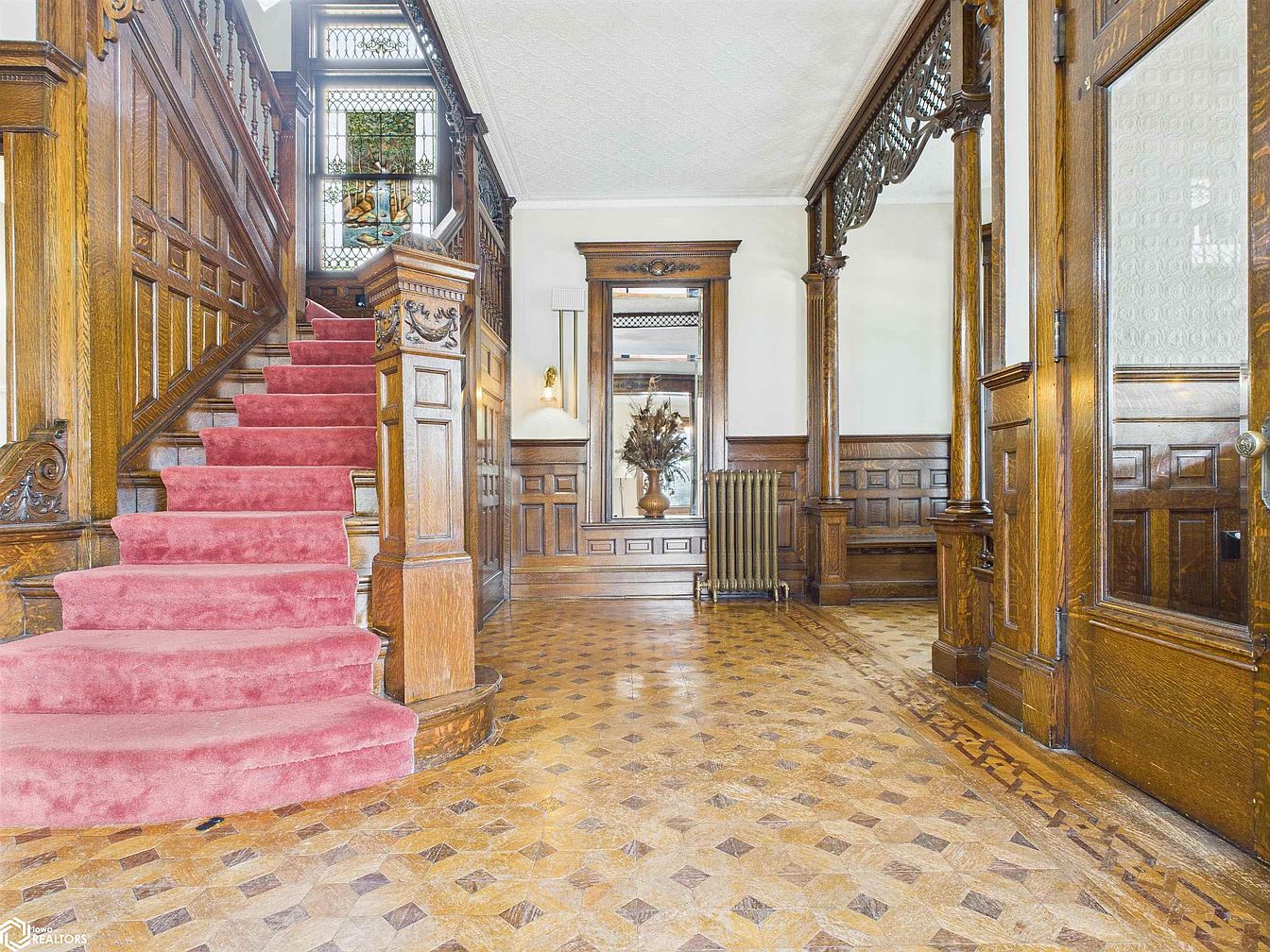 Step into a welcoming foyer with a stunning grand staircase, featuring plush, rose-colored carpeting that contrasts beautifully with the warm, rich tones of the original woodwork. Elegant paneling and decorative carvings on the banister bring timeless character, while leaded stained glass windows allow natural light to softly illuminate the space. The intricate parquet floor adds a sense of luxury underfoot and provides durability in a family-friendly entryway. Classic architectural details such as columns, ornamental arches, and glass-paneled doors enhance the sophistication, creating a refined yet inviting space ideal for welcoming guests and making lasting first impressions.