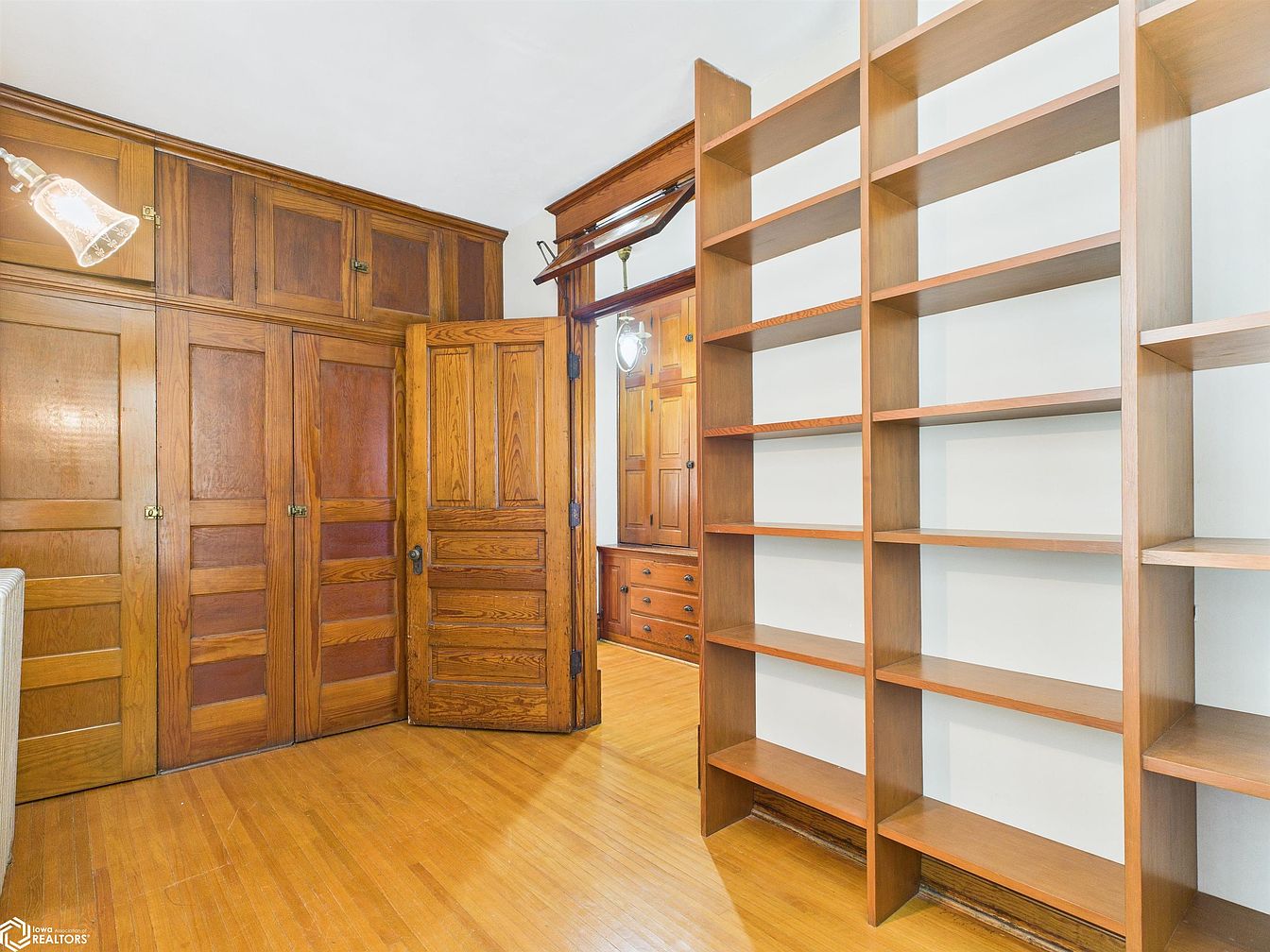 Warm wood tones dominate this cozy study area, featuring a wall of built-in shelves and classic paneled cabinetry for ample storage. The open shelving encourages organization for books, games, or collectibles, making it ideal for families or anyone who loves to keep things tidy and accessible. The room’s hardwood flooring is both practical and inviting, promoting a clean and uncluttered feel. Sturdy doors with vintage hardware add architectural charm and privacy, while generous overhead storage is perfect for seasonal items. Soft overhead lighting enhances the inviting ambiance, making this space both beautiful and functional for daily family life.
