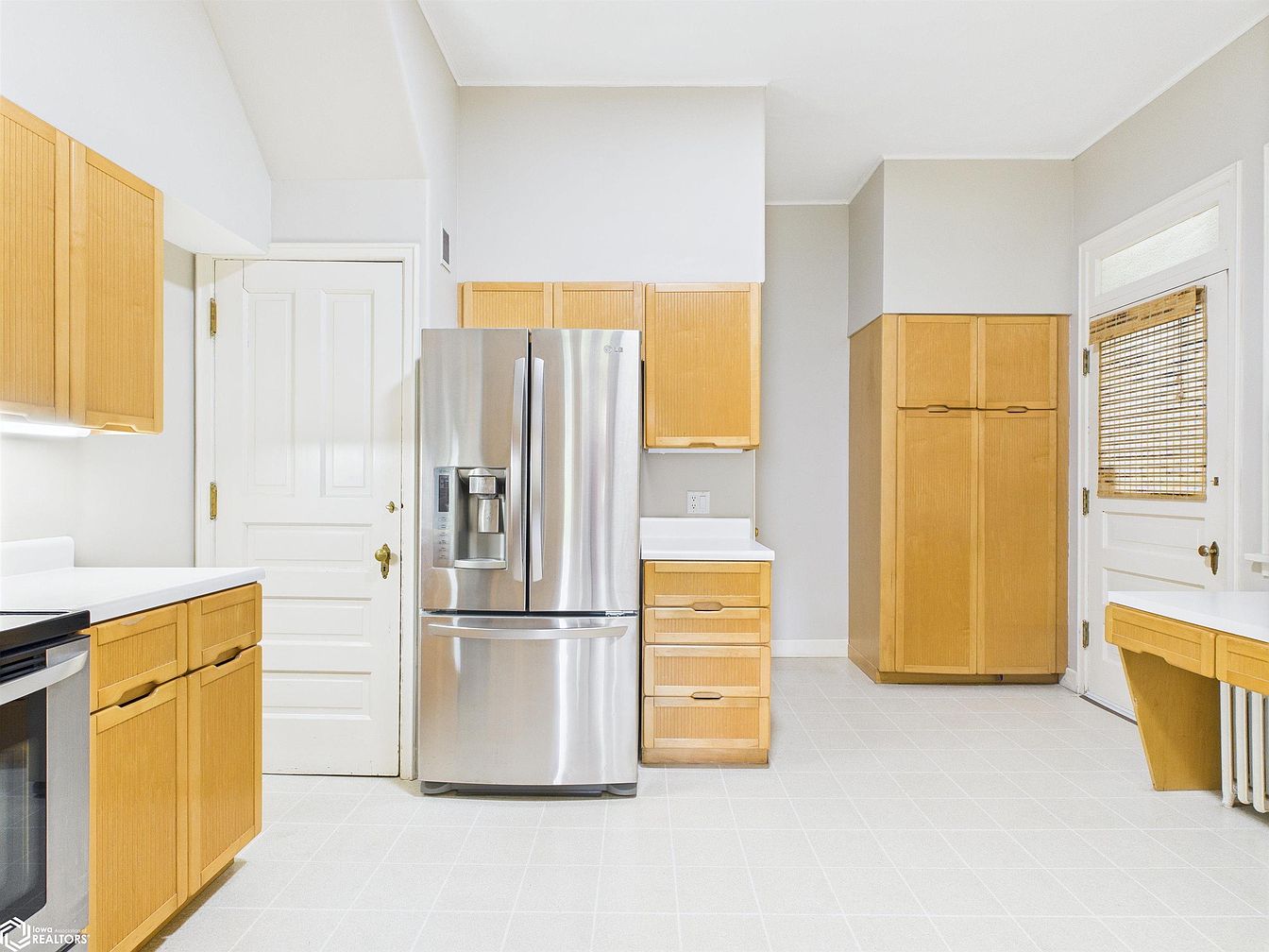 Spacious kitchen featuring a functional layout with warm light wood cabinetry and ample storage options, including a large pantry-style cupboard and generous drawer space for family necessities. The sleek stainless steel refrigerator blends seamlessly with the light neutral color palette and white countertops, creating a bright and inviting space. Soft gray walls provide a calm backdrop, while classic white doors and trim add a touch of elegance. The open floor plan offers plenty of room for movement—ideal for family cooking and gatherings. A cozy built-in desk nook along the window offers a spot for meal planning or kids’ homework, enhancing everyday utility.