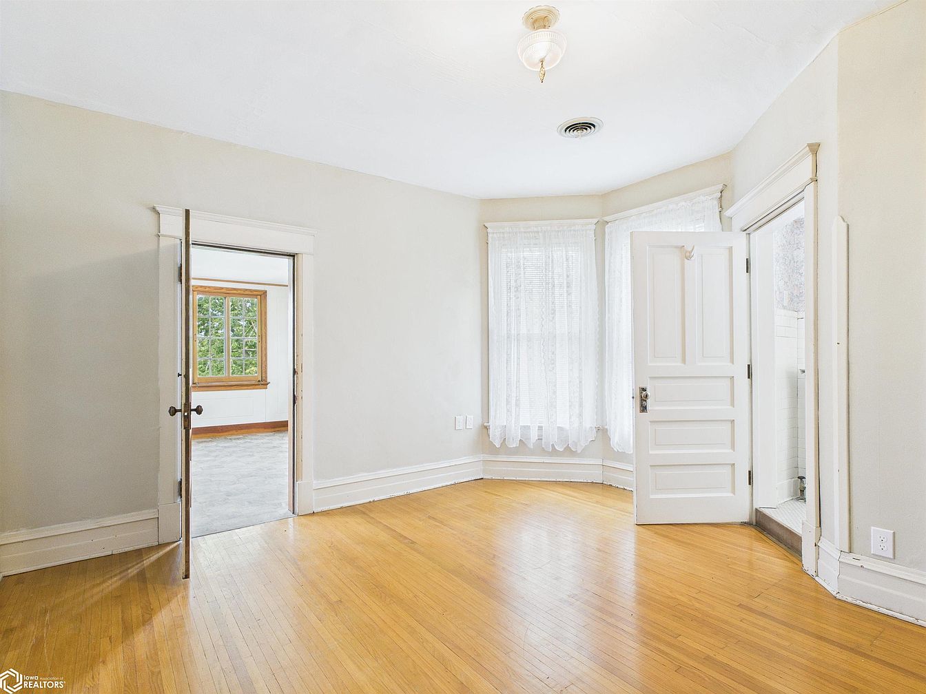 A spacious bedroom layout showcases natural hardwood floors that add warmth and charm, ideal for a family-friendly environment. The light cream walls and ample baseboard trim create a bright and airy atmosphere, highlighting the room’s classic architectural details. A bay window brings in generous sunlight, filtered through delicate white lace curtains, making the space feel both cozy and inviting. Two doors, one leading to an adjacent room with large windows and another to a bathroom, accentuate the functional flow, perfect for privacy and ease of access. This versatile space easily adapts to both restful nights and lively family mornings.