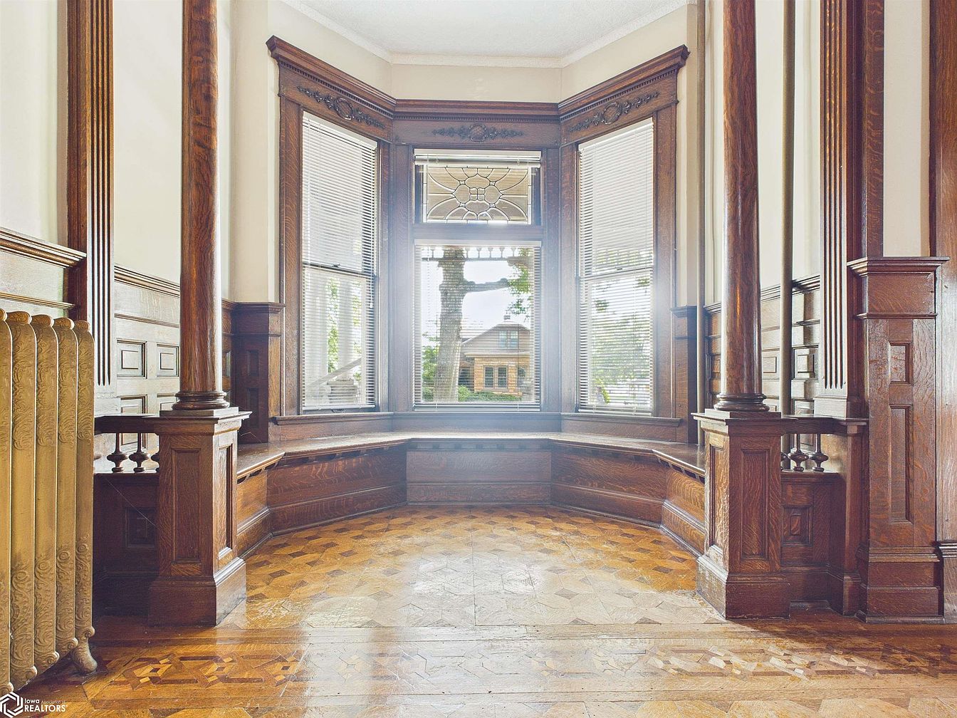 A welcoming bay window nook framed by ornate woodwork and stately columns, offering a perfect spot for reading or relaxing with family. The built-in window seat invites gatherings, while detailed wood paneling and intricate molding convey timeless beauty and craftsmanship. Honey-toned hardwood floors, laid in an elegant geometric pattern, add warmth and character. Large windows flood the space with natural light, making it an inviting retreat for all ages. The neutral wall color pairs gracefully with the rich wood tones, creating an atmosphere that balances classic elegance with family-friendly comfort and function.