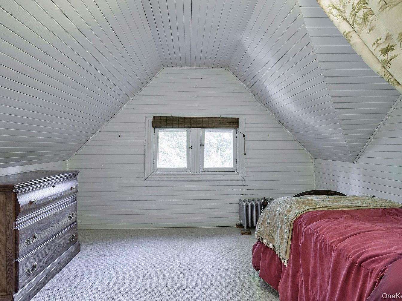 This charming attic bedroom features sloped, white-paneled ceilings that create a cozy yet airy ambiance. Natural light pours through a small, centered window, complemented by soft beige carpeting that adds comfort underfoot, perfect for families with children seeking a quiet private space. The bed, draped in a warm red velvet coverlet, anchors the room beside a wooden chest of drawers that offers generous storage for clothing or toys. Simple wood blinds and floral curtains frame the window, while the classic cast iron radiator hints at timeless comfort. Overall, the room’s calm palette and uncluttered design evoke a peaceful retreat ideal for unwinding.