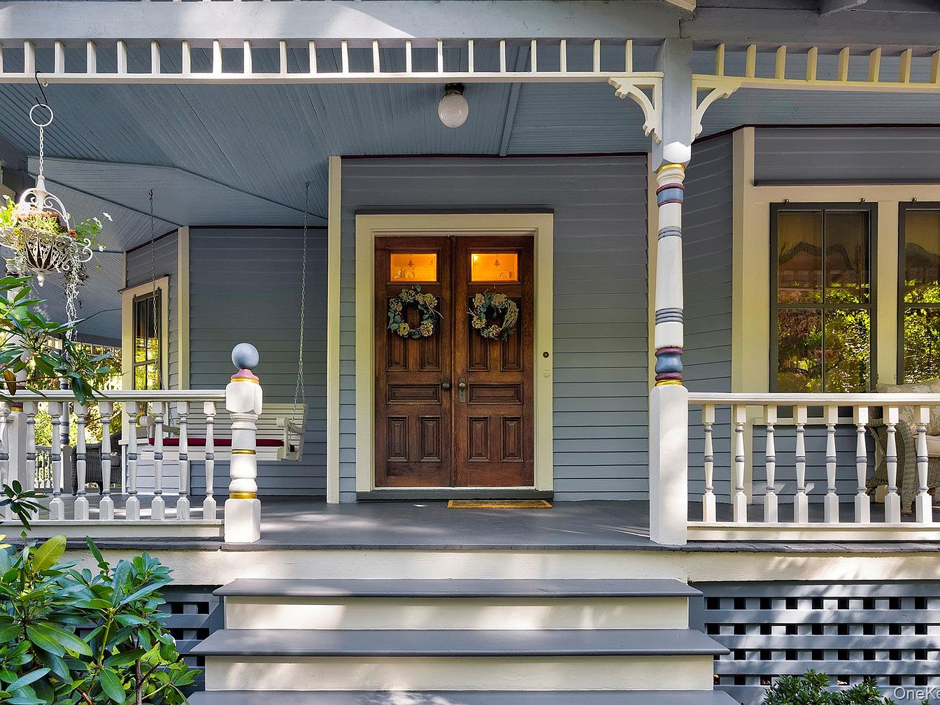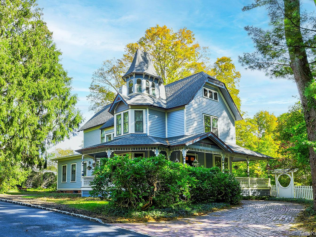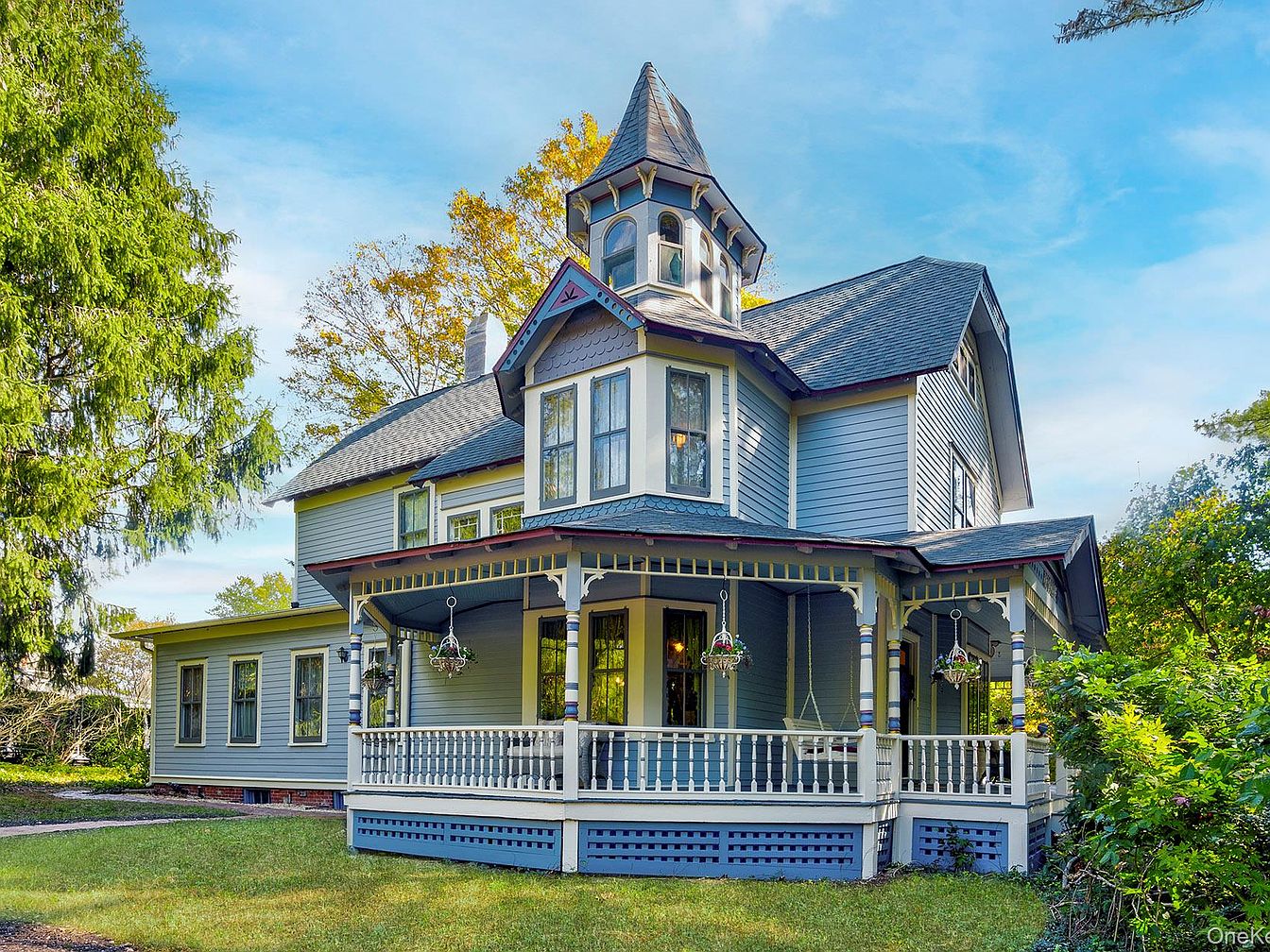 A classic wraparound front porch with ornate spindlework and decorative trim provides a welcoming entrance to this charming Victorian-style home. Large windows allow ample natural light to fill the interior, while the muted blue and cream exterior creates a soothing, timeless appeal. The turrets and roof peaks add architectural interest, and the covered porch features hanging flower baskets and a porch swing, perfect for family gatherings or relaxing afternoons. Surrounded by mature trees and lush greenery, the space is ideal for children to play safely or for adults to enjoy peaceful moments outdoors, blending elegance with everyday comfort.