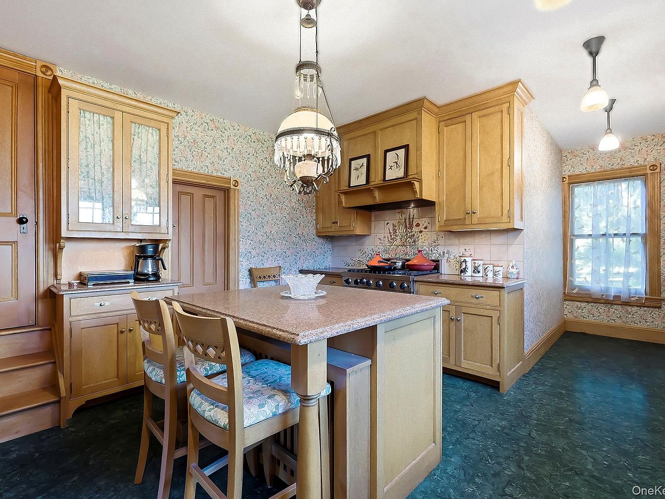 Warm wood cabinetry and a large central kitchen island create a welcoming and functional space for family gatherings and meal prep. The kitchen features patterned wallpaper that adds a touch of vintage charm, complemented by floral seat cushions, classic glass-front upper cabinets, and traditional trim. A charming setup with ample counter space makes it easy for children to join in cooking or homework at the island. Elegant pendant lights and a chandelier offer soft illumination, while large windows bring in natural light, enhancing the inviting atmosphere perfect for both daily routines and special family moments.