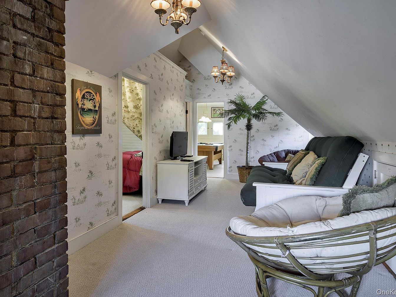 A cozy loft lounge offers a welcoming retreat for family and guests. The space features angled ceilings typical of attic conversions, creating an intimate environment, while light carpeting and wallpaper with subtle palm motifs enhance the airy, relaxed vibe. Comfortable futons and a papasan chair supply ample seating for movie nights or quiet reading, with soft pillows adding warmth and comfort. A feature brick wall introduces rustic texture, contrasting with the room’s otherwise bright palette. The space is equipped with a small media console and TV, making it great for family time, while the open layout allows effortless movement between adjacent rooms.