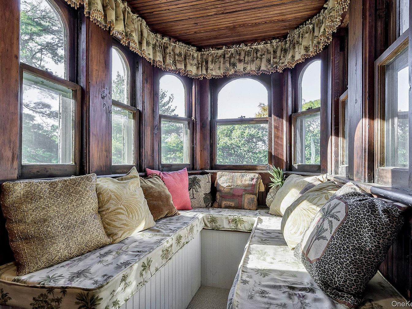 A cozy sunroom offers a welcoming, family-friendly spot with built-in cushioned bench seating that lines the rounded walls, creating an intimate gathering space perfect for reading, relaxing, or enjoying morning coffee together. Tall, arched windows framed in rich, dark wood allow abundant natural light to flood in and provide picturesque views of the trees and garden outside. Warm, earth-toned throw pillows and tropical-patterned upholstery combine for a relaxed, inviting ambiance. Ornate, tasseled valances add a touch of vintage charm, while the wood-paneled ceiling enhances the cottage-like feel, making this sun-drenched nook an ideal retreat for all ages.