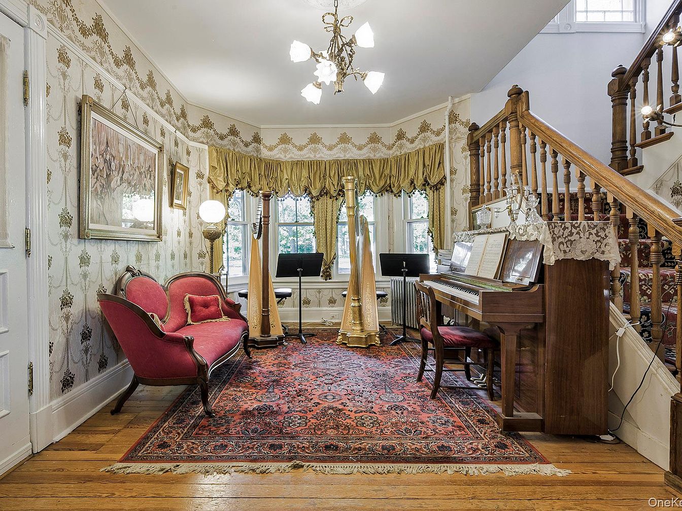 An inviting music parlor blends vintage elegance with family-friendly comfort, centered around a classic upright piano and grand harp near graceful windows framed by rich gold drapery. Warm wooden floors are softened by a detailed Persian rug, complementing the ornate wallpaper and period light fixture above. The carved wooden staircase adds architectural charm, while a velvet settee with deep rose upholstery and a delicate lace runner over the piano provide a splash of romantic color. Perfect for music gatherings or quiet moments, this space balances artistic inspiration, ample seating, and traditional beauty, making it welcoming for all ages.