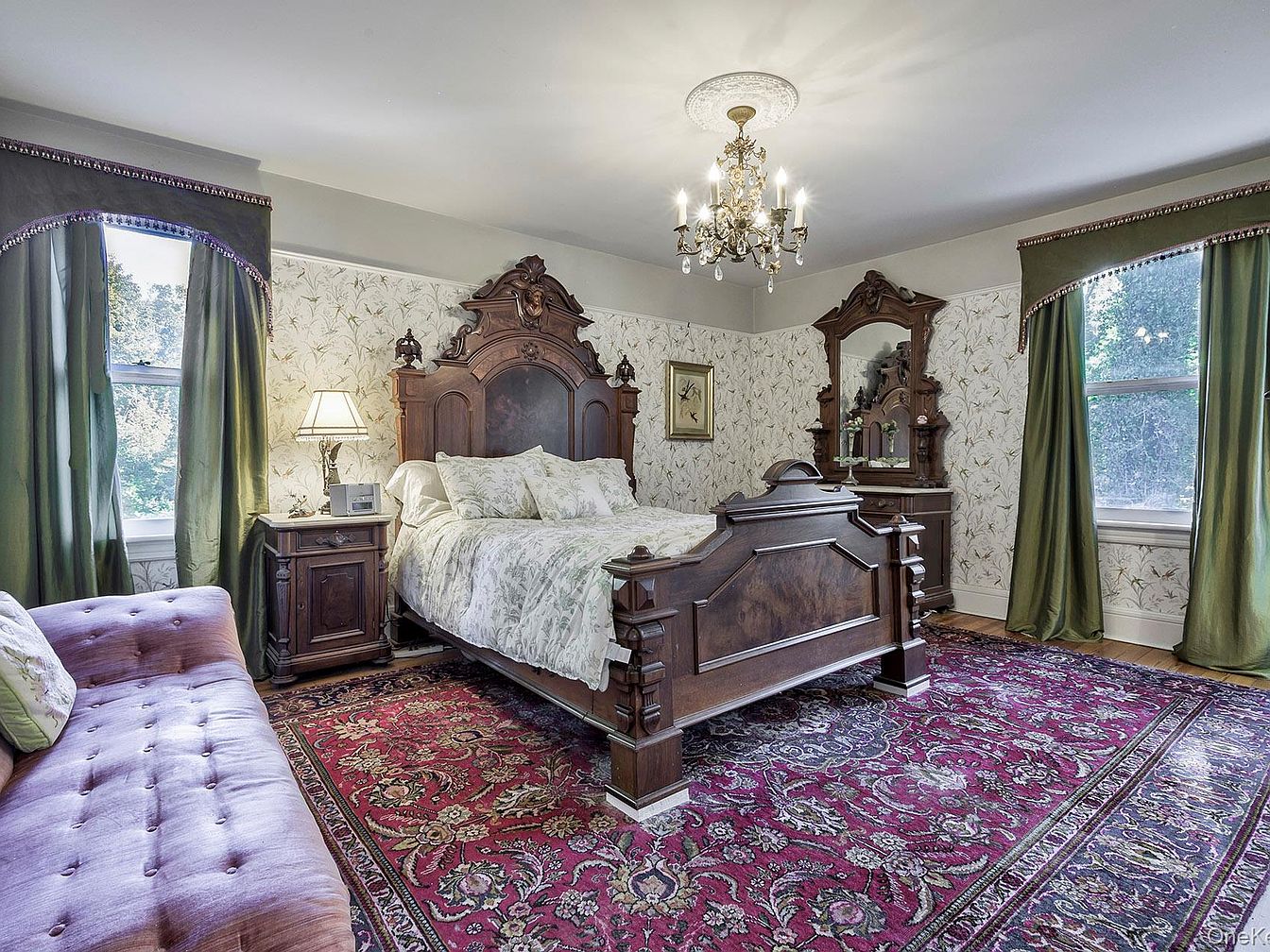 This spacious bedroom embodies Victorian-inspired sophistication, featuring an intricately carved wooden bed and matching dresser with a striking mirror. The room is adorned with floral-patterned wallpaper and lush, olive green drapes that frame large windows, inviting plenty of natural light. A luxurious crimson area rug with ornate designs adds warmth and complements the period furnishings. A tufted chaise lounge in a pale lavender hue offers a cozy reading nook, perfect for relaxing or story time with children. The chandelier overhead and detailed ceiling medallion further accentuate the space’s timeless charm, making it both elegant and family friendly.