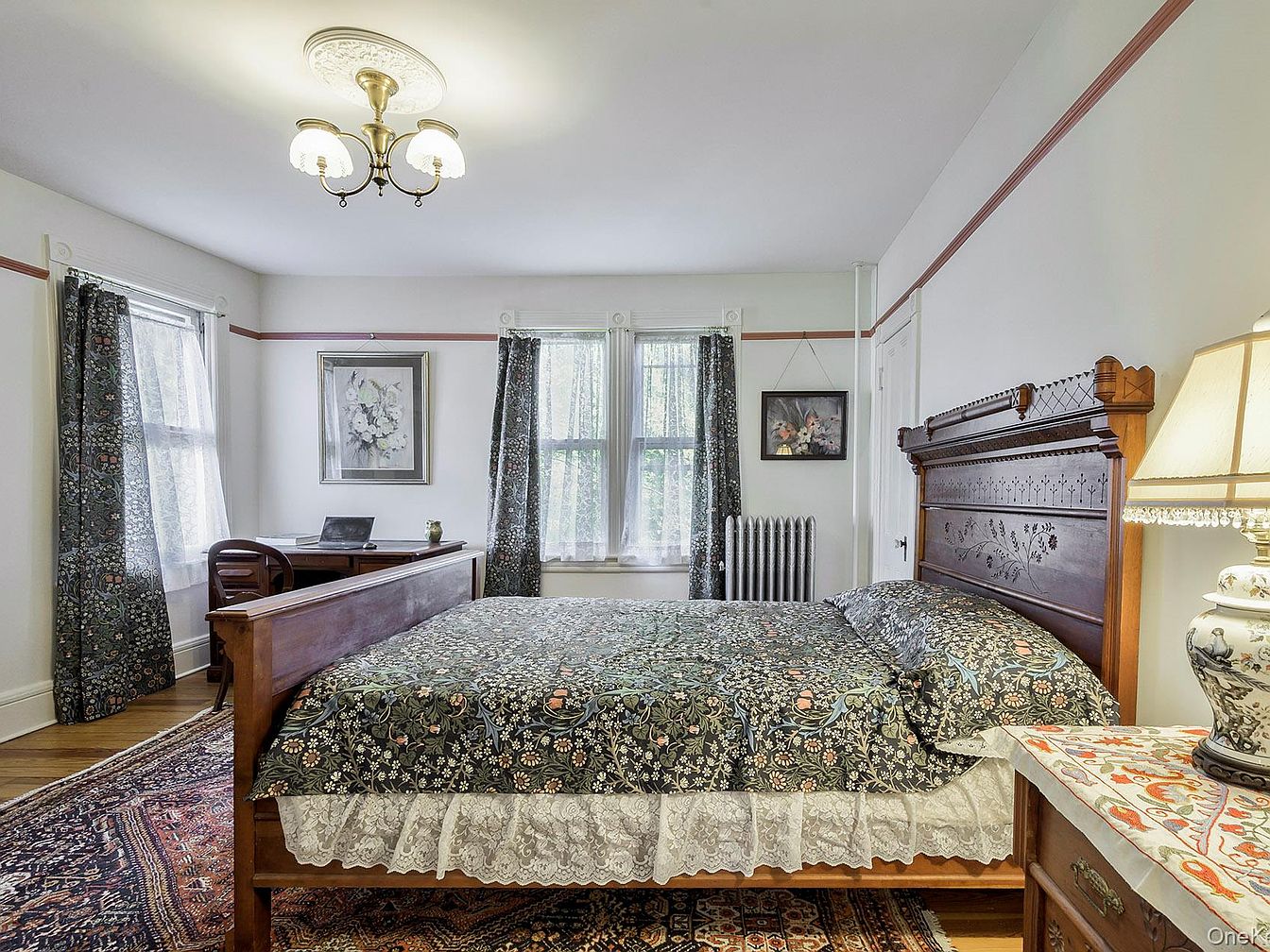 A spacious and inviting bedroom featuring a beautifully carved wooden bed with an intricately patterned headboard and matching floral bedding. The room is filled with natural light from three large windows dressed in elegant matching curtains, evoking a warm and comfortable ambiance. Family-friendly touches include a large, sturdy desk for work or study and a soft area rug perfect for children to play on. The palette pairs warm wood tones with soft, off-white walls, accented by subtle trim. Decorative details, like the vintage lamp, floral artwork, and radiator, add charm and a welcoming touch to this tranquil retreat.