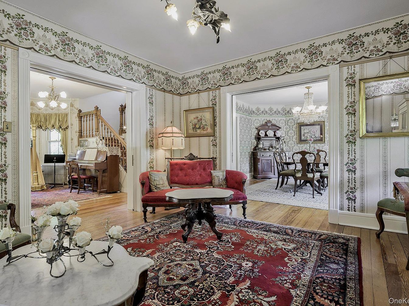This inviting parlor area seamlessly flows into a dining room and music nook, creating an open yet clearly defined family-friendly living space. The parlor features elegant Victorian-inspired furniture with velvet upholstery in deep burgundy, perfectly complementing the richly patterned area rug. Ornate floral wallpaper with wainscoting and decorative trim add vintage charm, while polished hardwood floors enhance warmth. Large entryways between rooms allow natural light to fill the space and encourage family gatherings, play, and movement between rooms. The marble-topped tables and abundance of florals provide classic touches, making the area ideal for entertaining or relaxing with loved ones.