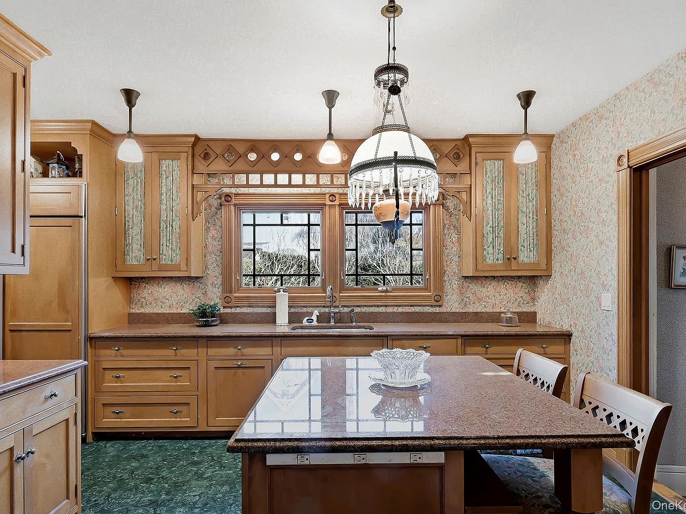 Warm wood cabinetry and a large central island form the heart of this inviting kitchen. The countertops feature a deep, natural stone hue that contrasts elegantly with the honey-toned woodwork. Classic floral wallpaper and etched glass cabinet fronts add a touch of vintage charm, fostering a homey, family-friendly ambiance. Overhead, a statement chandelier with crystal accents and ambient pendant lights provide balanced illumination. The island doubles as both prep space and casual dining area, with comfortable seating for children or guests, while the placement of windows above the sink welcomes natural light, ensuring the space feels bright and welcoming throughout the day.