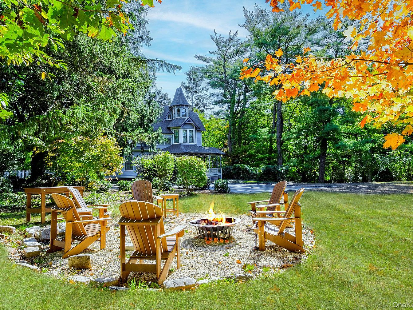 A welcoming outdoor retreat highlights a circular fire pit surrounded by classic Adirondack chairs, creating an ideal space for family gatherings or relaxing evenings under the stars. The area is framed by lush greenery and mature trees, providing privacy, natural shade, and a serene atmosphere. Bright fall foliage adds a burst of color, while the elegant Victorian-style home in the background features timeless architectural details and a soft gray-and-white color palette. The gravel base and stone border around the fire pit add rustic charm, and wide-open grassy spaces invite play and outdoor activities for all ages.