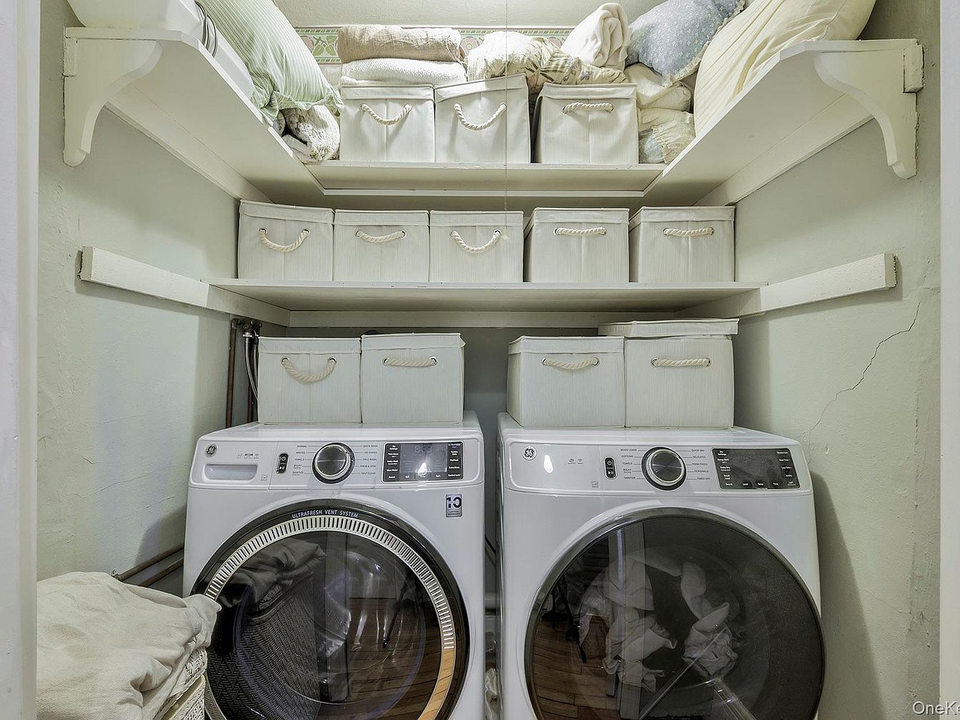 This compact laundry space is thoughtfully designed for practicality and ease, perfect for busy families. The front-loading washer and dryer are neatly tucked beneath sturdy, wall-mounted shelves, maximizing vertical storage. Soft, mint-green walls create a fresh atmosphere, while cream fabric bins with rope handles bring cohesion and charm to the overall look. Above, shelves are filled with labeled bins and extra linens, ensuring everything has a place. The arrangement encourages tidiness and efficiency, making family laundry routines simple. The natural wood floor peeks out, adding warmth, and the overall aesthetic is clean, uncluttered, and highly functional for everyday living.