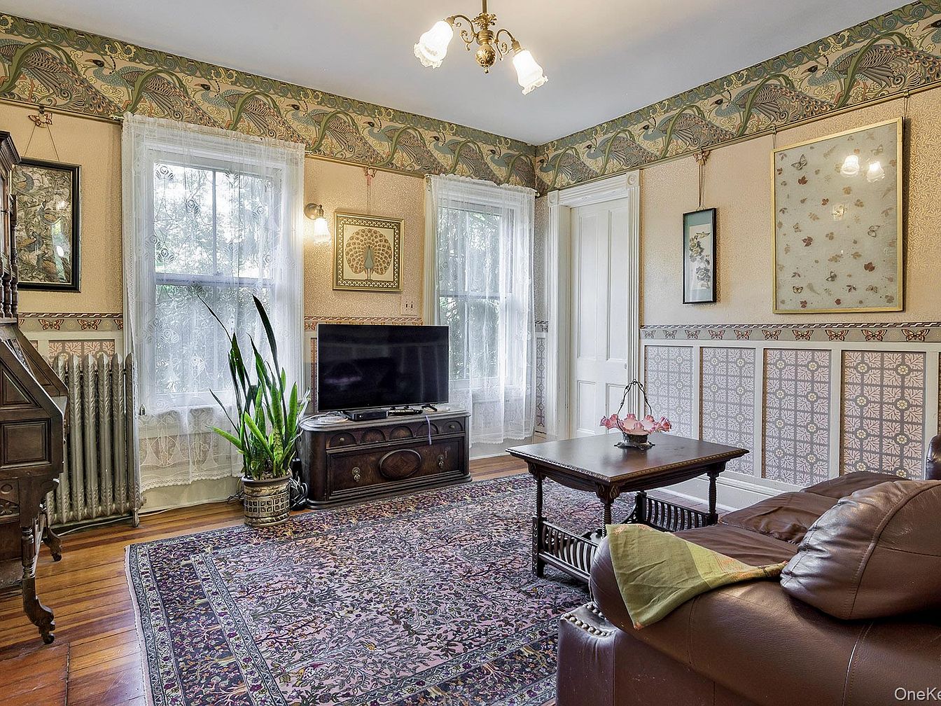 A charming living room featuring elegant period wallpaper and ornate woodwork, exuding a classic American home aesthetic. Two tall windows, dressed in delicate lace curtains, provide ample natural light while a richly patterned area rug anchors the room and adds warmth. The room is furnished with a comfortable leather sofa and a wooden coffee table, ideal for family gatherings. Decorative elements include vintage wall art, potted greenery, and a central TV stand that blends seamlessly with the traditional style. Original hardwood floors and a classic radiator underscore the historic ambiance, creating a cozy, inviting atmosphere perfect for both relaxation and entertaining.