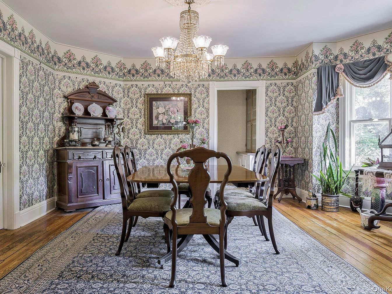 A formal dining room exudes vintage charm and warmth, featuring ornate floral wallpaper and crisp white trim that highlight the home’s classic American architecture. The wooden dining table and elegant high-back chairs invite family gatherings and shared meals, while a matching antique buffet adorned with decorative china adds character and functionality. Hardwood floors are softened by a richly patterned area rug, balancing elegance with comfort. Crystal chandeliers and delicate curtains with tassel detailing enhance the room’s refined atmosphere. The abundance of natural light from the large windows and the presence of indoor plants create a welcoming, family-friendly ambiance perfect for everyday use or holiday celebrations.