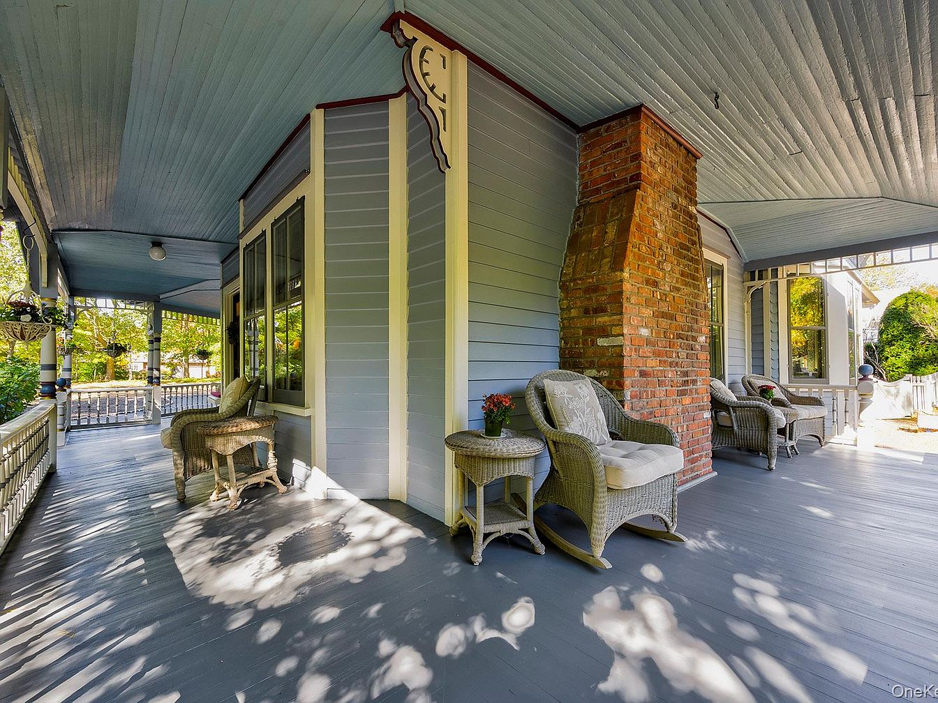 A spacious wraparound porch invites relaxation, encircling the home with its charming blue painted floors and ceilings. Wicker armchairs with plush cushions and matching tables create numerous cozy seating areas perfect for family gatherings, morning coffee, or watching children play safely in the yard. The exposed brick chimney adds a touch of rustic character, while the architectural trim and railing details evoke traditional American design. Soft, natural light pours through surrounding trees, highlighting the subtle gray-blue siding and cream accents. This porch blends comfort, style, and family-friendly practicality, offering an idyllic outdoor extension for any home.