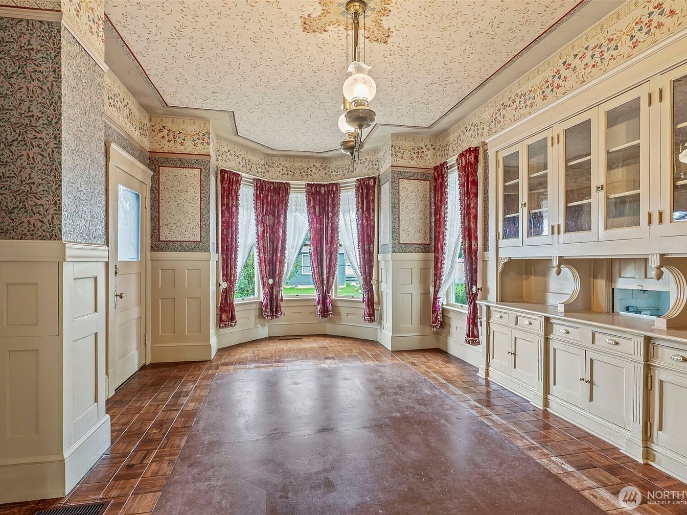 This spacious dining room features a charming bay window, adorned with elegant sheer curtains and rich, deep red drapes that frame natural light beautifully. The intricate floral wallpaper adds a touch of vintage charm, while the patterned ceiling creates an inviting atmosphere. A classic built-in cabinet showcases storage and display options, blending seamlessly with the white wainscoting. The hardwood flooring adds warmth, complementing the room’s sophisticated design. Ideal for families, the open layout encourages gatherings, making it perfect for meals and celebrations. This room balances timeless elegance with functionality, embodying a classic American home aesthetic.