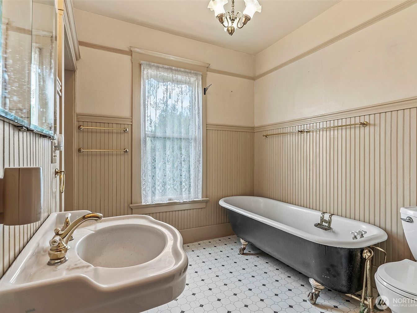 This delightful bathroom combines vintage charm with modern functionality. The clawfoot bathtub serves as a stunning centerpiece, featuring elegant black exterior contrast paired with classic white enamel. The hexagonal floor tiles add a touch of sophistication, harmonizing beautifully with the wainscoting and pale wall color. Natural light floods in through the large window adorned with delicate lace curtains, enhancing the spacious feel. Vintage-inspired fixtures, including a porcelain sink with luxurious gold accents, offer both style and convenience. Ample towel rails provide family-friendly practicality, ensuring a perfect blend of comfort and aesthetic appeal for everyday use.
