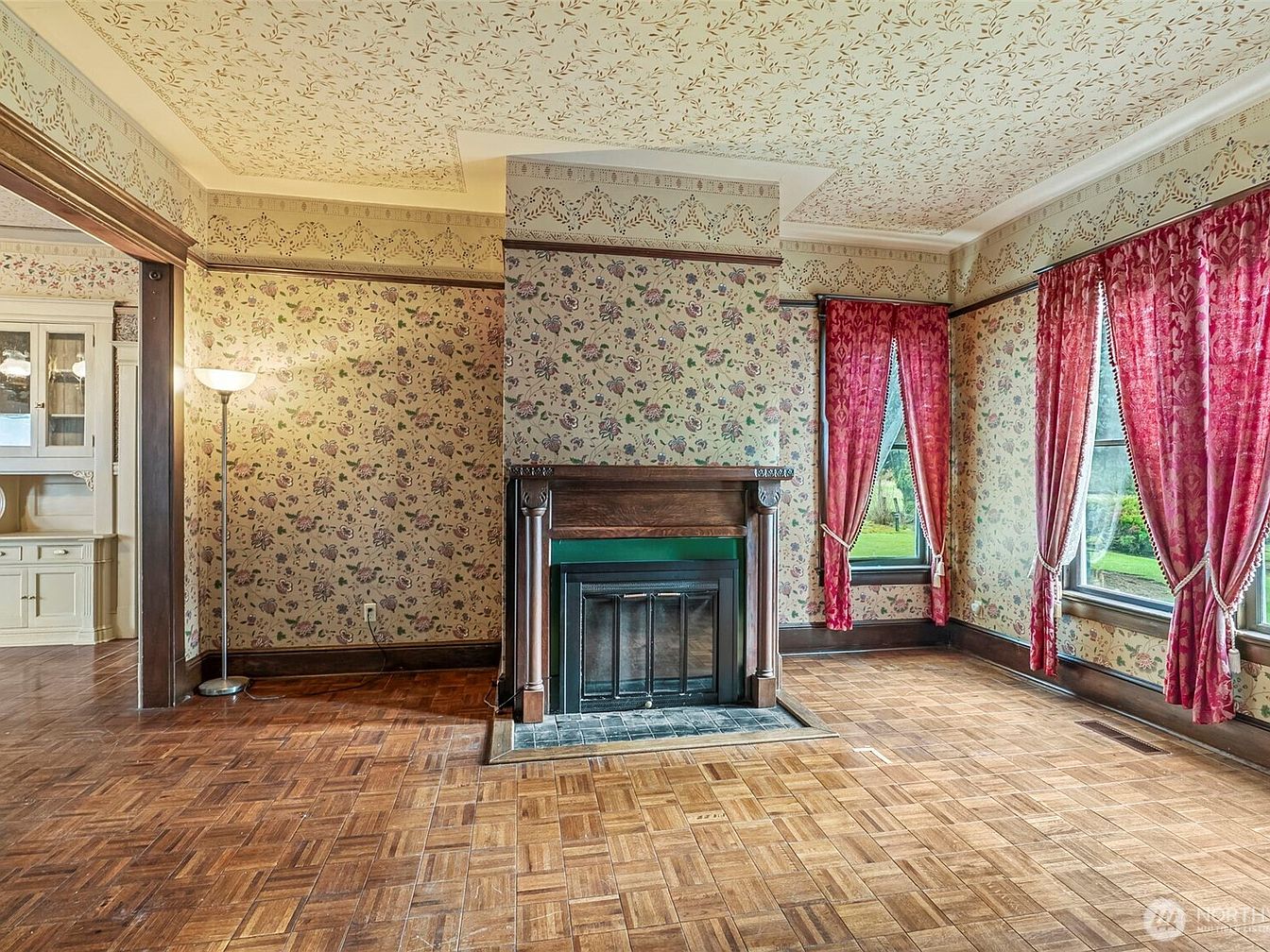 This inviting living room features a charming blend of vintage aesthetics and modern comfort. The rich wooden flooring showcases intricate parquet patterns, while the floral wallpaper complements the warm tones of the room. Large windows framed by elegant red drapery allow natural light to flood in, creating a bright and welcoming atmosphere. A classic fireplace, adorned with a green mantel, serves as a focal point, perfect for family gatherings on chilly evenings. The layout encourages interaction and relaxation, making it an ideal space for family moments and entertaining guests, embodying a cozy yet stylish charm.