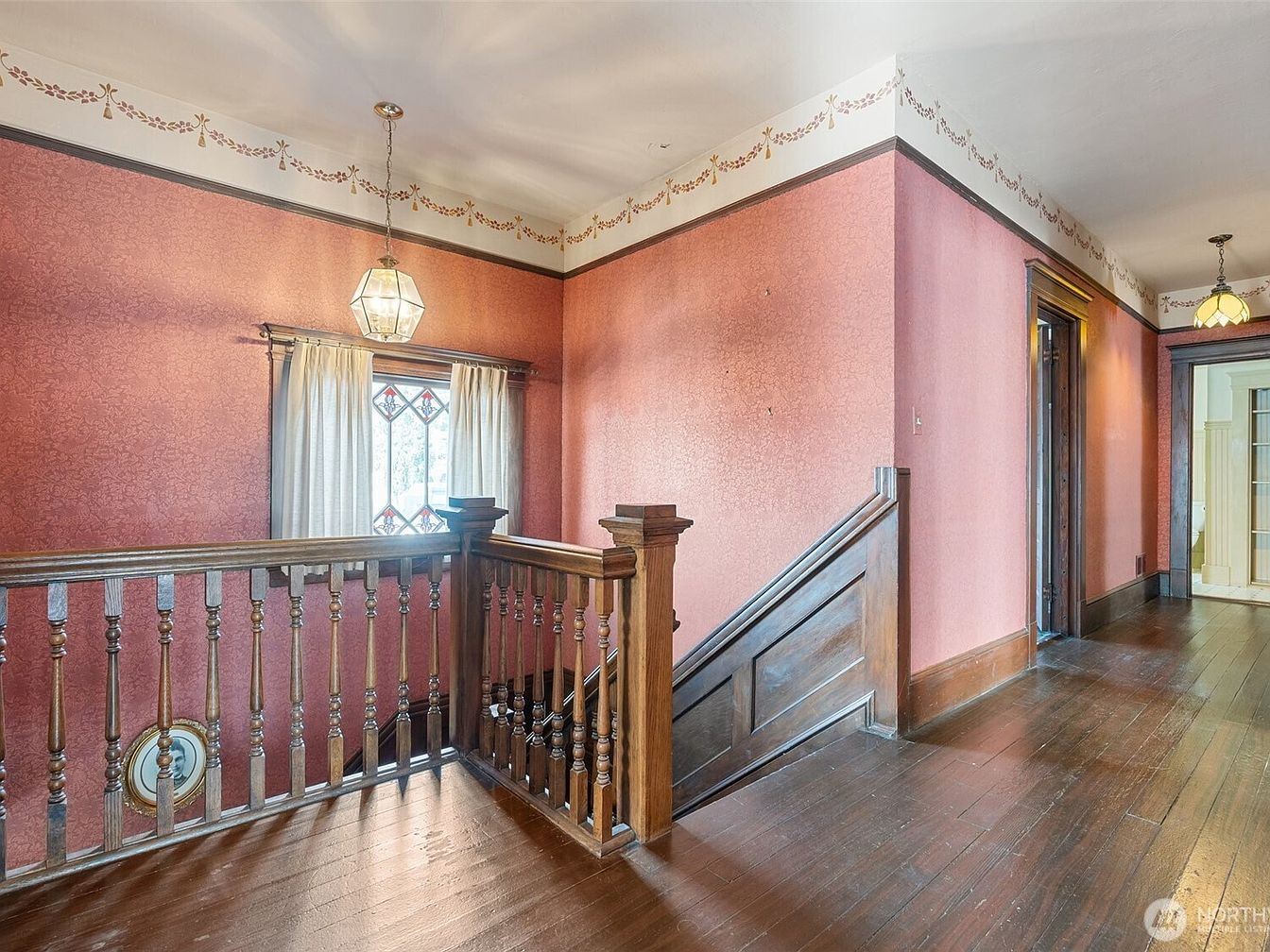 The upper hallway showcases an inviting layout, blending classic architecture with modern comfort. Rich, rosy walls create a warm ambiance, accentuated by intricate floral molding near the ceiling. Natural light pours in through a stained glass window, framed by elegant curtains that soften the space. The polished wooden banister adds a touch of sophistication, while the hardwood flooring leads to further rooms, enhancing the flow of the home. Pendant lighting casts a gentle glow, highlighting the architectural details and making it a perfect family-friendly area for gatherings and everyday moments.