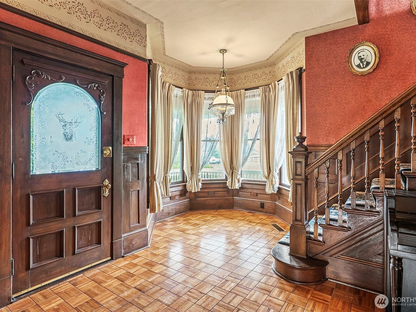 This charming entrance hallway features a stunning blend of classic design and cozy warmth. The rich wooden front door, adorned with elegant glasswork featuring a deer motif, invites guests into a spacious area with gleaming parquet flooring. Soft, earthy tones of warm red and cream create an inviting atmosphere, complemented by the ample natural light streaming through large, arched windows draped in flowing curtains. Beautifully detailed wainscoting and an intricately crafted staircase add character, while vintage portraits on the wall evoke a sense of history. A chandelier overhead contributes a touch of sophistication, perfect for family gatherings.