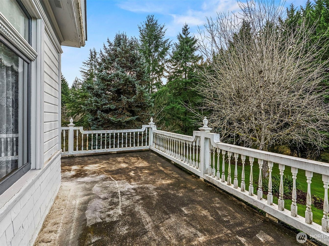 This inviting balcony offers a seamless blend of comfort and nature, perfect for relaxation. A decorative white railing enhances the aesthetic while providing safety, complementing the home’s charming architecture. The worn yet characterful flooring suggests cherished family moments and gatherings. Surrounded by lush evergreen trees, the serene backdrop creates an oasis of tranquility, ideal for morning coffees or evening chats. The space is thoughtfully designed, allowing room for potted plants or intimate seating. The warm sunlight filtering through enhances the inviting atmosphere, making this balcony a delightful retreat that fosters family bonding and outdoor enjoyment.