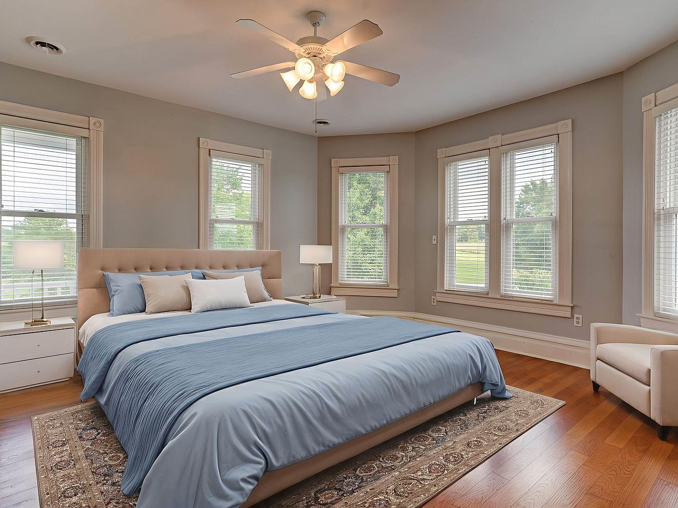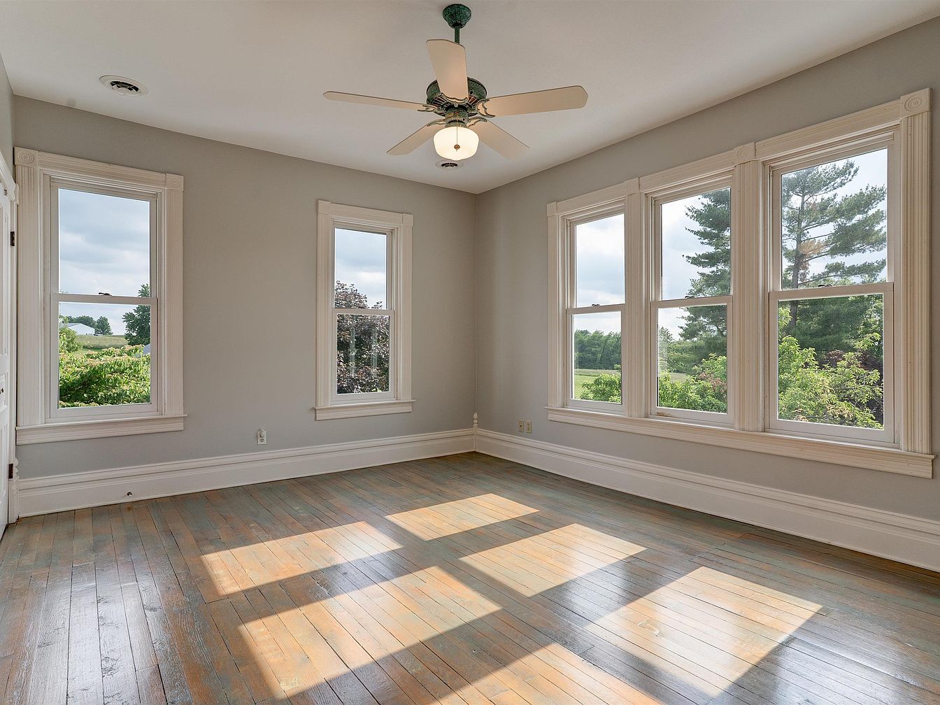 This spacious bedroom features large windows that invite natural light, creating a warm and inviting atmosphere. The subtle gray walls provide a calming backdrop, while the hardwood floor, with its rustic charm, adds character and warmth. A ceiling fan adds comfort, enhancing the room’s functionality. The architectural details, such as the classic moldings around the windows, exemplify timeless elegance. Perfect for family living, the layout allows for easy furniture arrangement, fostering a cozy space for relaxation or play. With a serene view of the lush outdoors, this room blends tranquility with a connection to nature, ideal for restful nights.